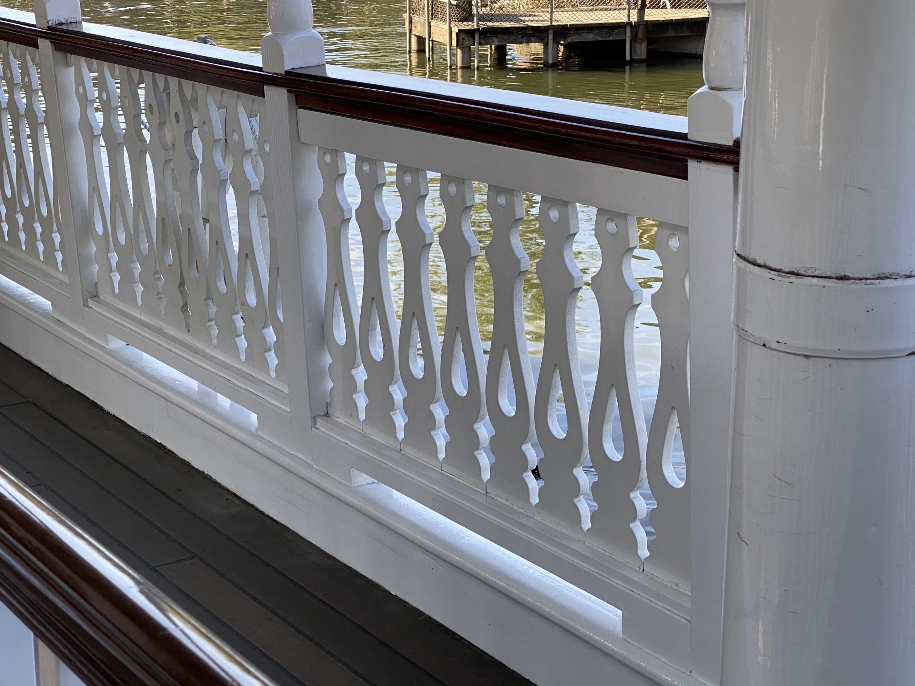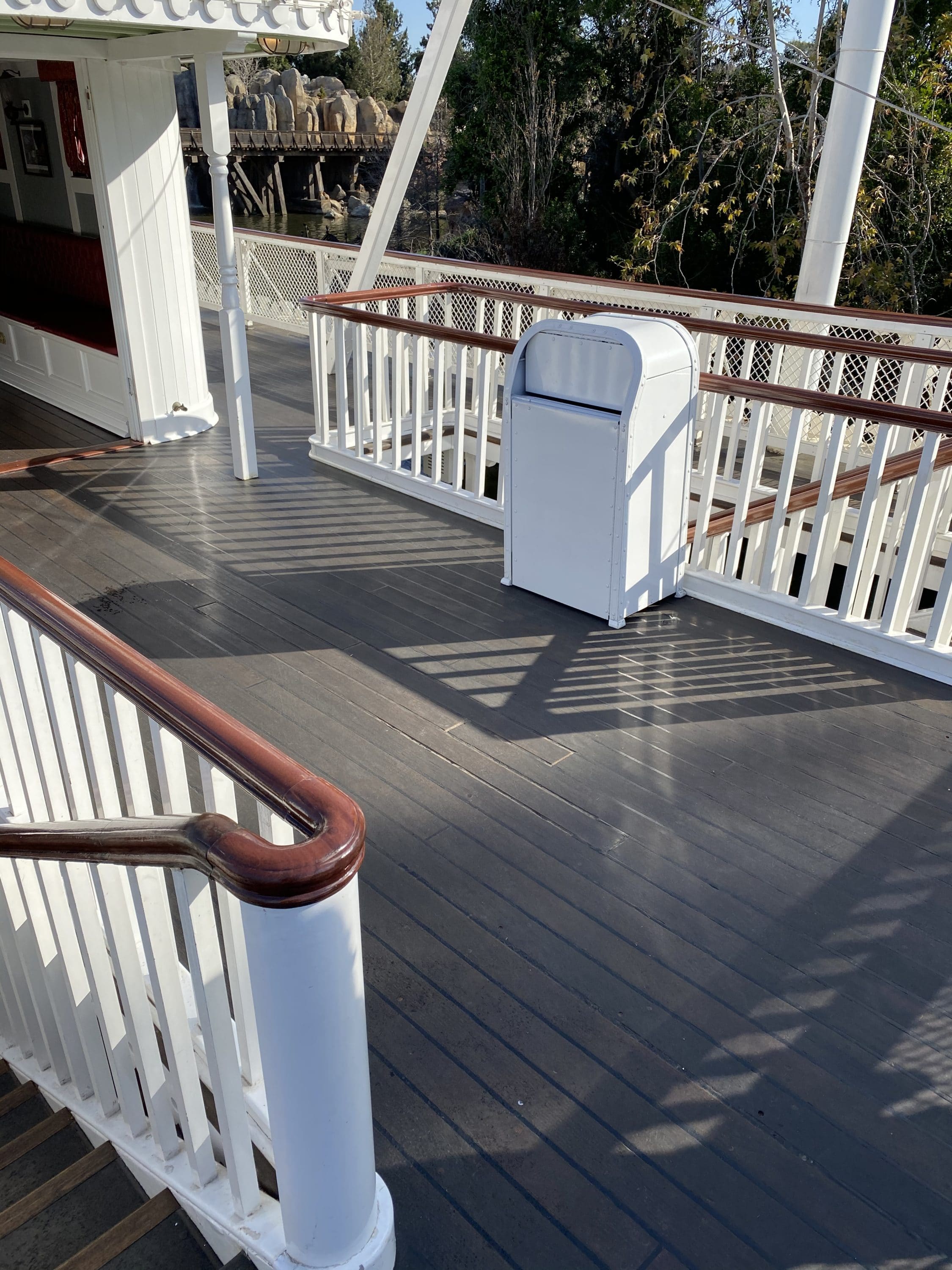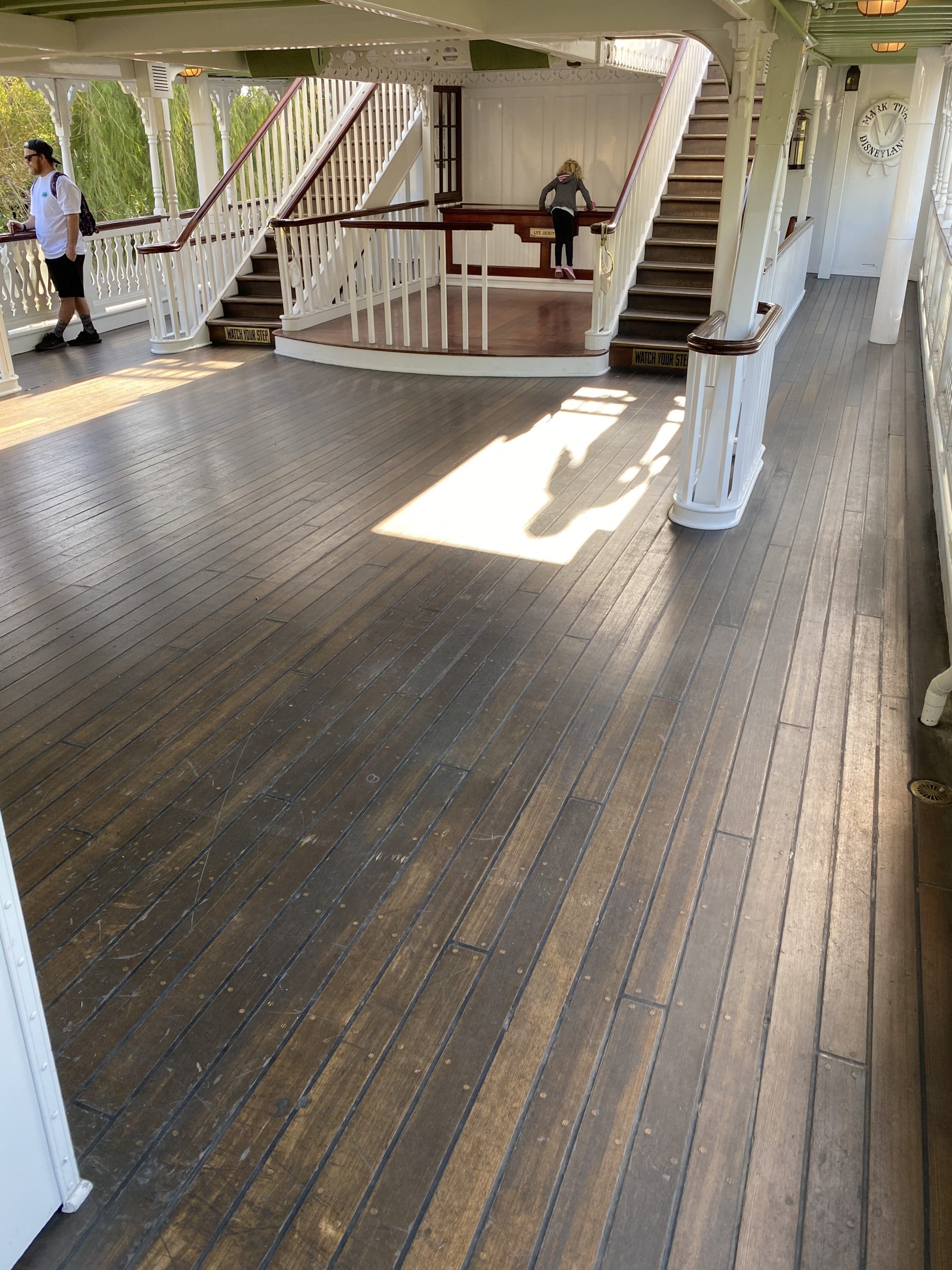 DAPS MAGIC correspondent and Mark Twain enthusiast Steven hopped on the Mark Twain this morning to check out the work done during the refurbishment. The boat looks beautiful and continues to shine as she cruises the Rivers of America. Take a look at the polished rails, new paint, and floor work!