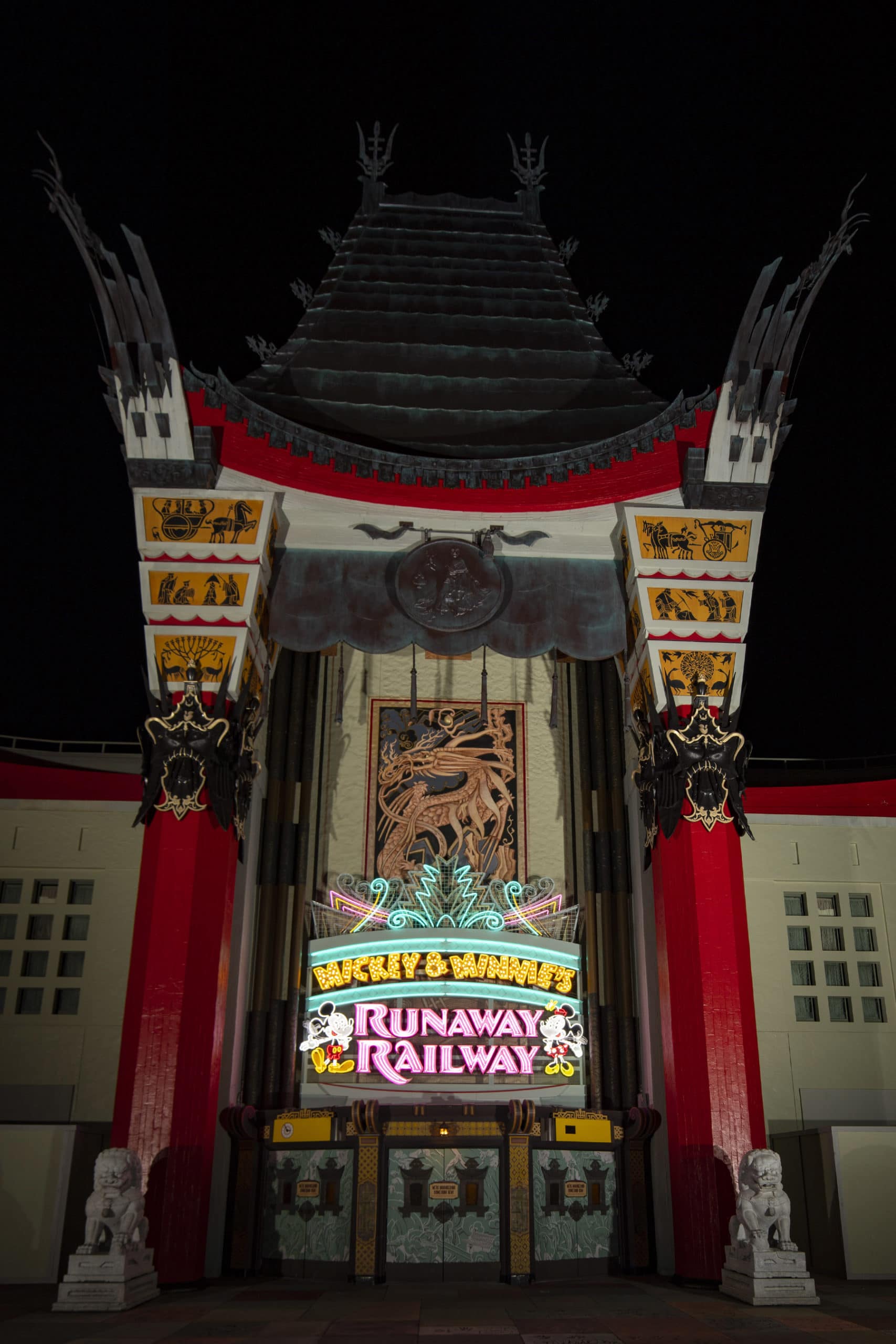 Mickey & Minnie’s Runaway Railway will be opening at Disney’s Hollywood Studios on March 4, 2020. Ahead of its grand opening, the new marquee debuted above the entrance on the Chinese Theatre. This new attraction will be the first ride-through attraction in Disney history that will be focused on Mickey and Minnie Mouse.