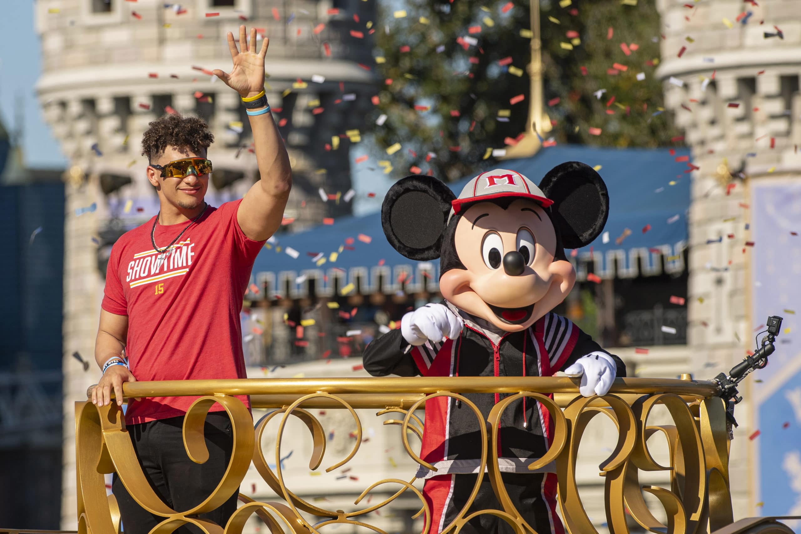 Kansas City Chiefs quarterback and Super Bowl MVP Patrick Mahomes stars in a celebratory parade with Mickey Mouse on Monday, Feb. 3, 2020. The two paraded through Magic Kingdom Park at Walt Disney World Resort in Lake Buena Vista, Fla. (David Roark, Photographer)