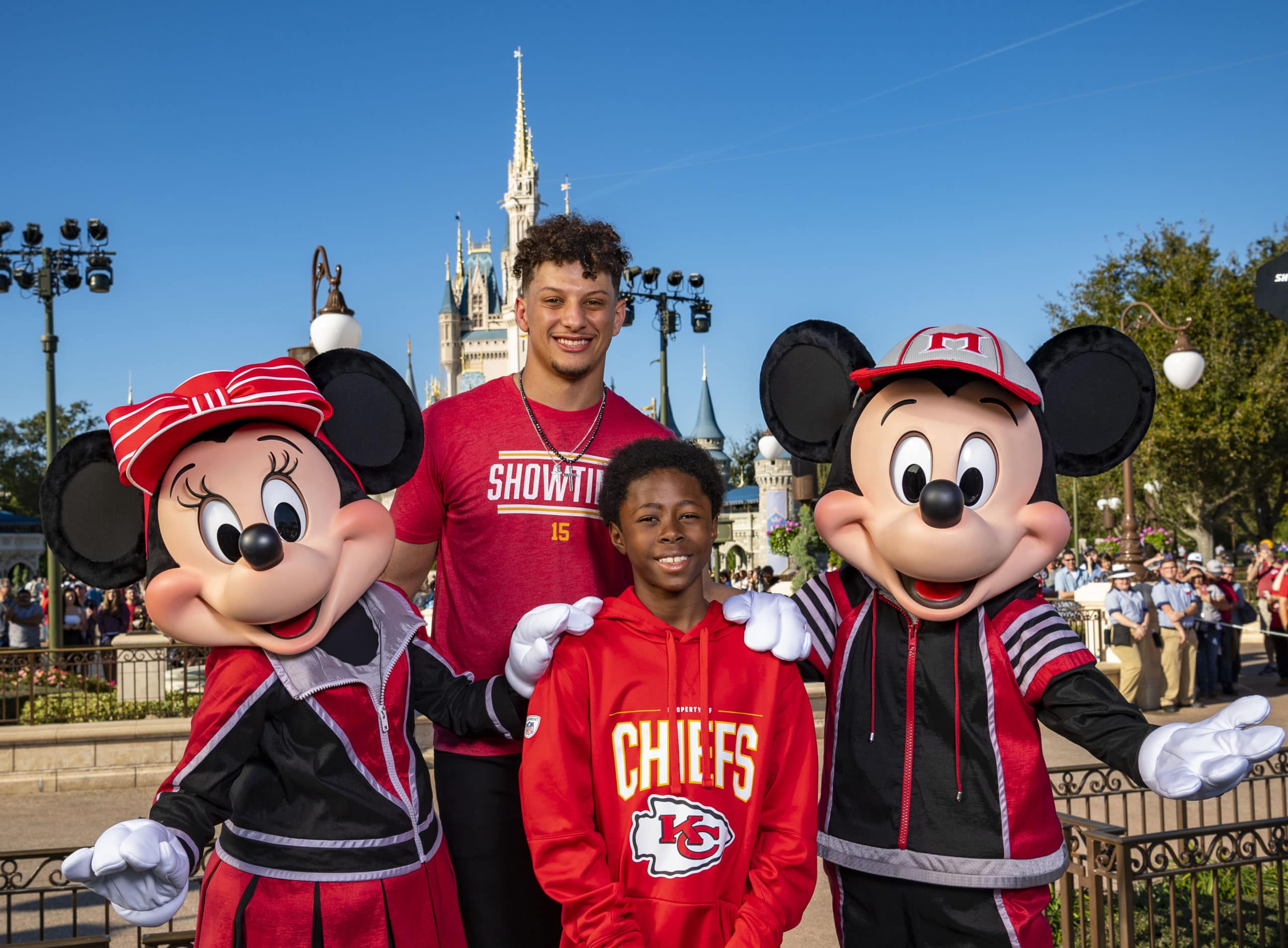 Kansas City Chiefs quarterback and Super Bowl MVP Patrick Mahomes shares a special memory with a Make-A-Wish child – 10-year-old Nathaniel from Texas – along with Mickey Mouse and Minnie Mouse on Monday, Feb. 3, 2020, at Walt Disney World Resort in Lake Buena Vista, Fla. Nathaniel and 17 other Make-A-Wish children whose wishes were to attend the Super Bowl joined in festivities as part of the traditional Super Bowl celebration at Magic Kingdom Park. Disney Parks previously announced it will donate $1 million to Make-A-Wish in honor of Mahomes’ MVP performance and to make even more magical wishes come true in the future. Disney helps grant more than 10,000 wishes each year. (Matt Stroshane, Photographer)