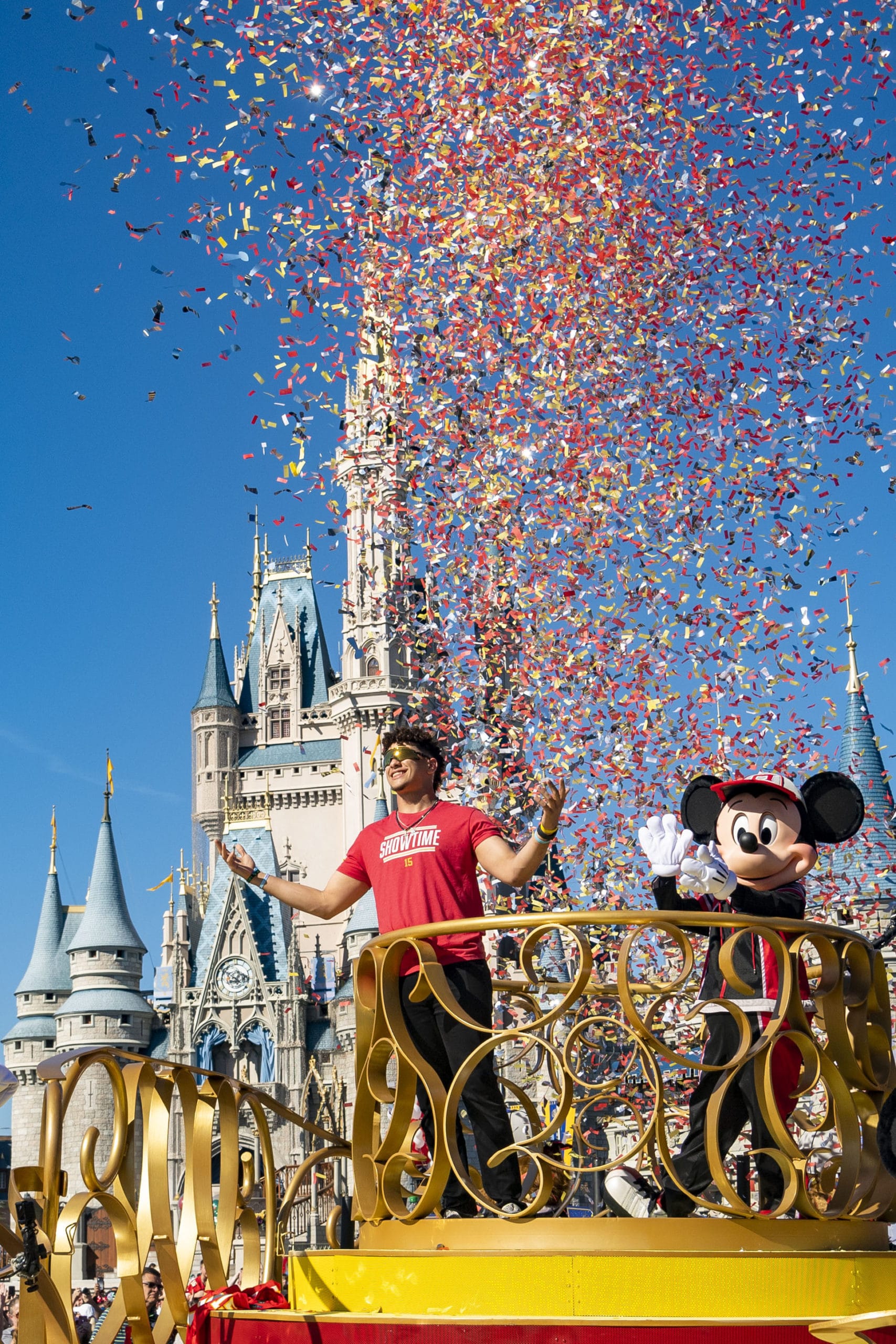 Kansas City Chiefs quarterback and Super Bowl MVP Patrick Mahomes stars in a celebratory parade with Mickey Mouse on Monday, Feb. 3, 2020. The two paraded through Magic Kingdom Park at Walt Disney World Resort in Lake Buena Vista, Fla. (Gregg Newton, Photographer)