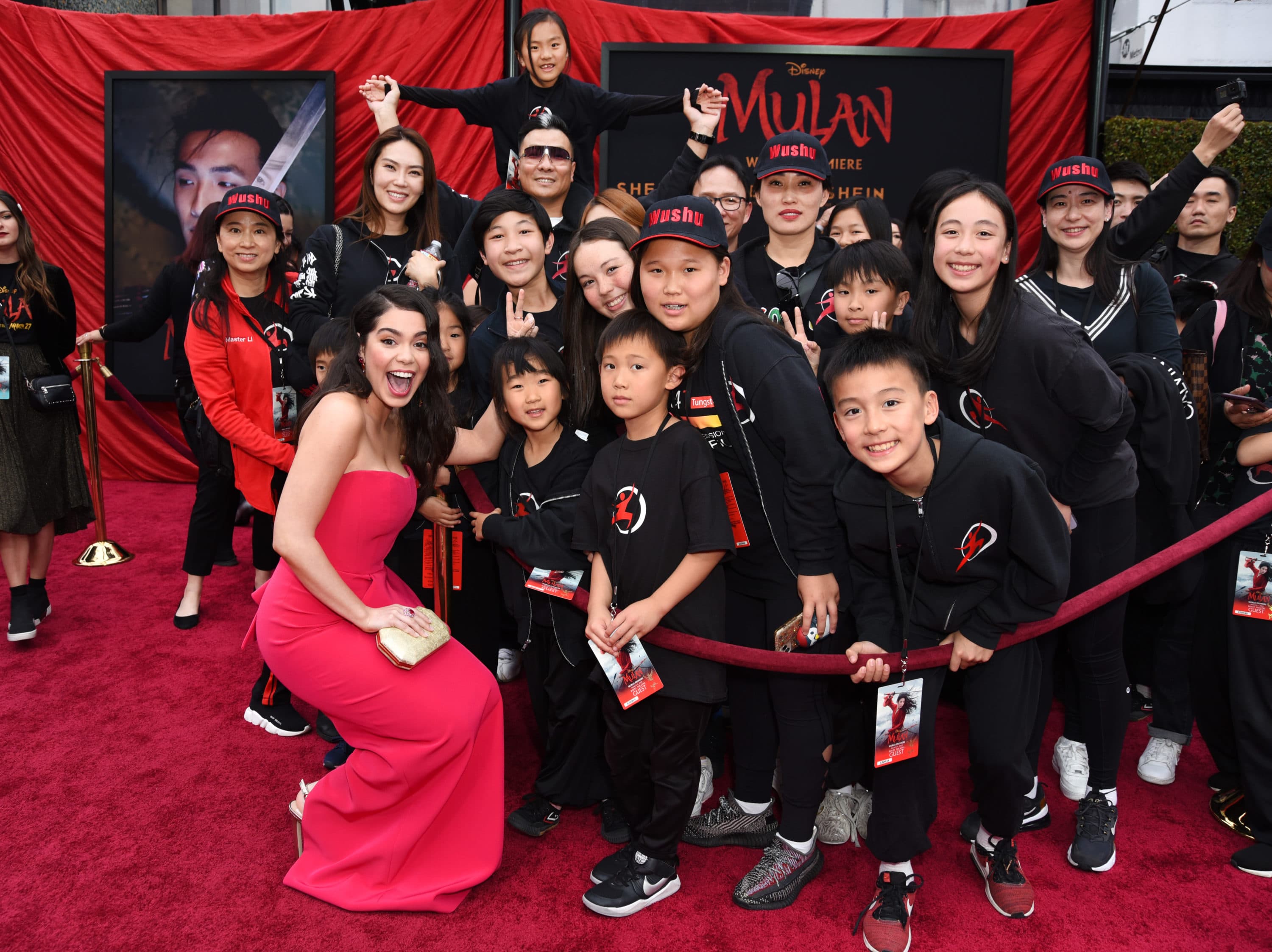 HOLLYWOOD, CALIFORNIA – MARCH 09: Ruthie Davis (C) and University of Delaware students attend the World Premiere of Disney’s ‘MULAN’ at the Dolby Theatre on March 09, 2020 in Hollywood, California. (Photo by Alberto E. Rodriguez/Getty Images for Disney)