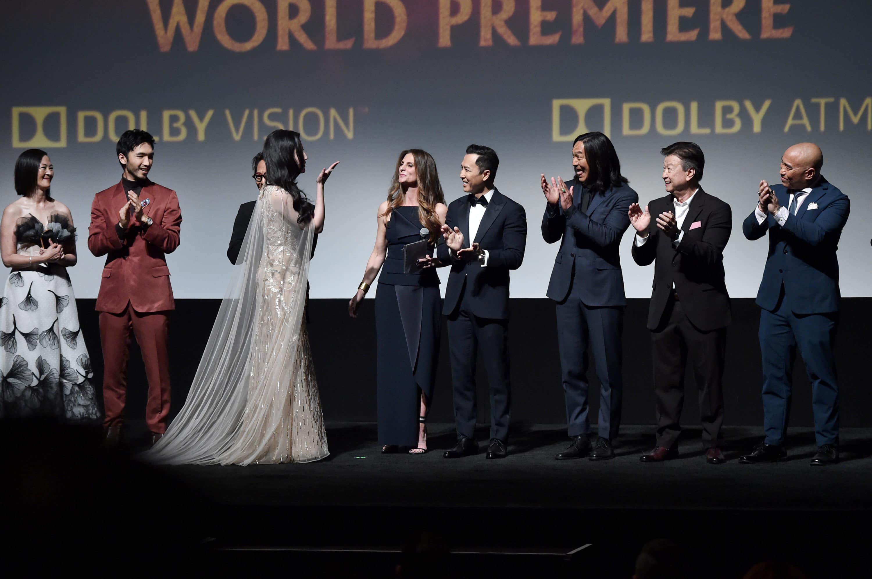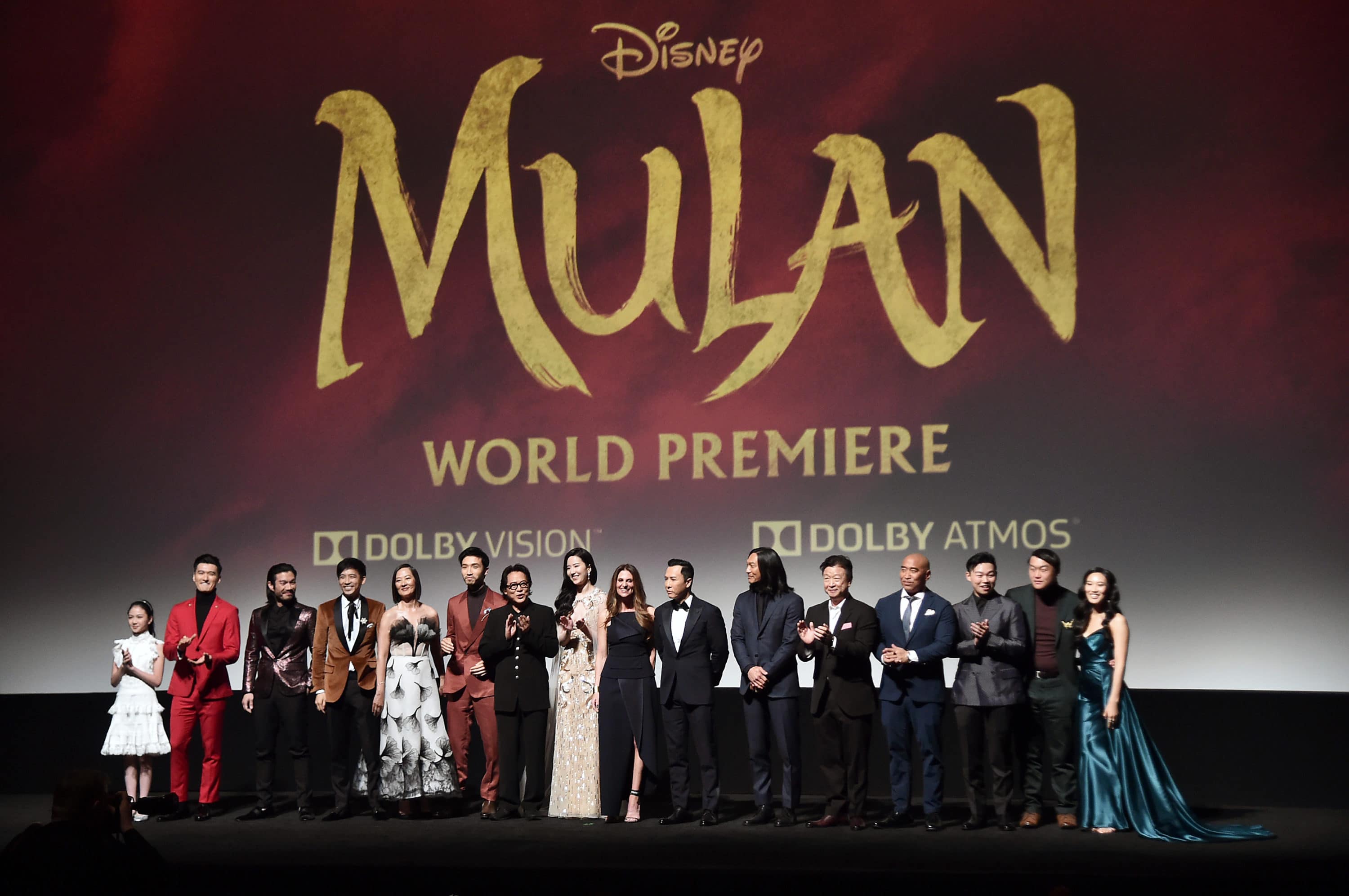 HOLLYWOOD, CALIFORNIA – MARCH 09: (L-R) Crystal Rao, Chen Tang, Nelson Lee, Jimmy Wong, Rosalind Chao, Yoson An, Jet Li, Yifei Liu, Director Niki Caro, Donnie Yen, Jason Scott Lee, Tzi Ma, Ron Yuan, Jun Yu, Doua Moua, and Xana Tang speak onstage during the World Premiere of Disney’s ‘MULAN’ at the Dolby Theatre on March 09, 2020 in Hollywood, California. (Photo by Alberto E. Rodriguez/Getty Images for Disney)