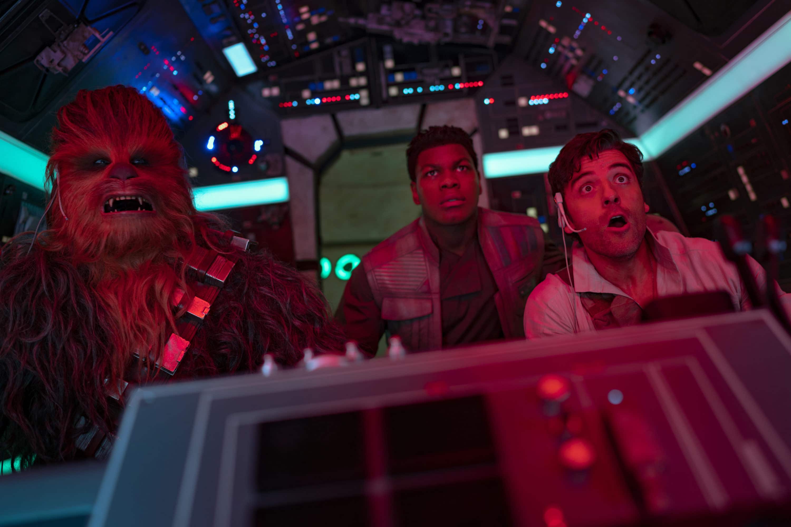 Joonas Suotamois Chewbacca, John Boyega is Finn and Osacr Isaac is Poe Dameron in STAR WARS: THE RISE OF SKYWALKER.