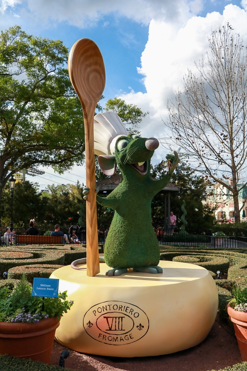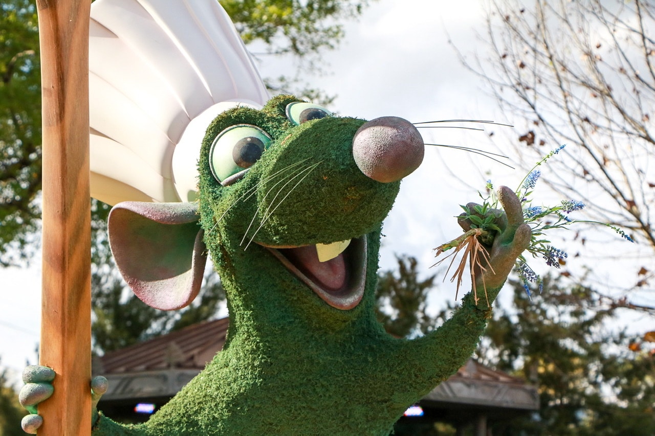 With all of the construction happening in Epcot, many topiaries were moved to new locations. And some character topiaries didn’t make it into the festival this year. However, the newest topiary added might have been the cutest! Remy the Rat from Ratatouille was the newest addition and found his home in the France Pavilion. His arrival was to celebrate the upcoming Ratatouille attraction opening this year in the France Pavilion.