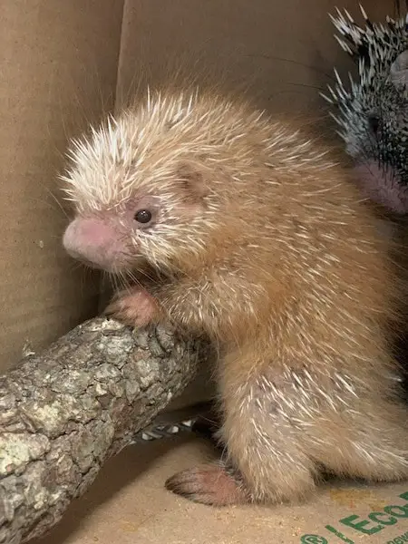 When Shelley was born, she was covered in a soft reddish fur. Their quills are hidden underneath. After birth, the quills begin to harder. Shelley is now about three times the weight of when she was born at the end of February.