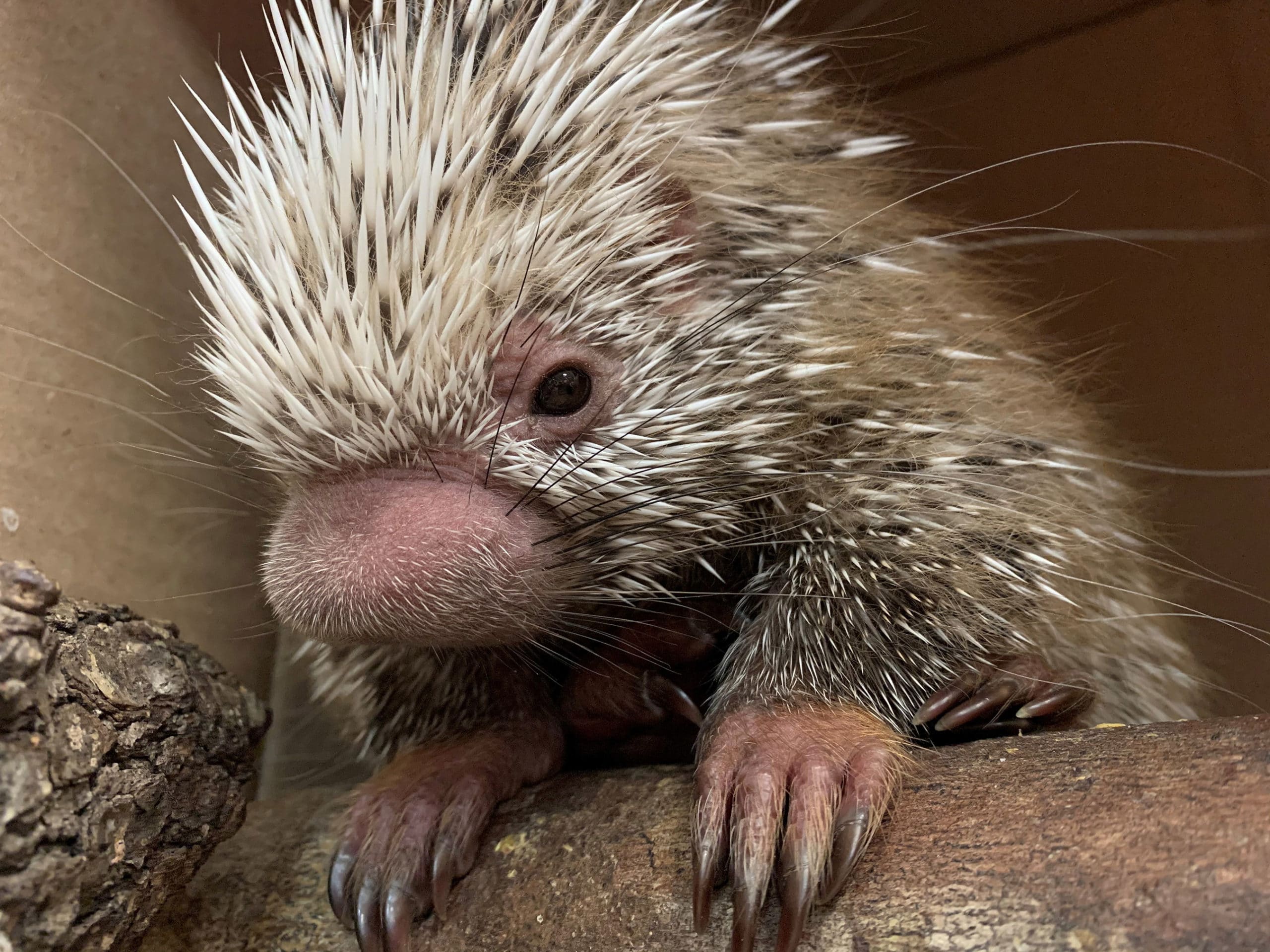Shelley the porcupette is a prehensile-tailed porcupine. This is one of twelve species of New World porcupines. This particular species would be found in South America. There, they live in trees and eat roots. A porcupette is what a baby porcupine is called.