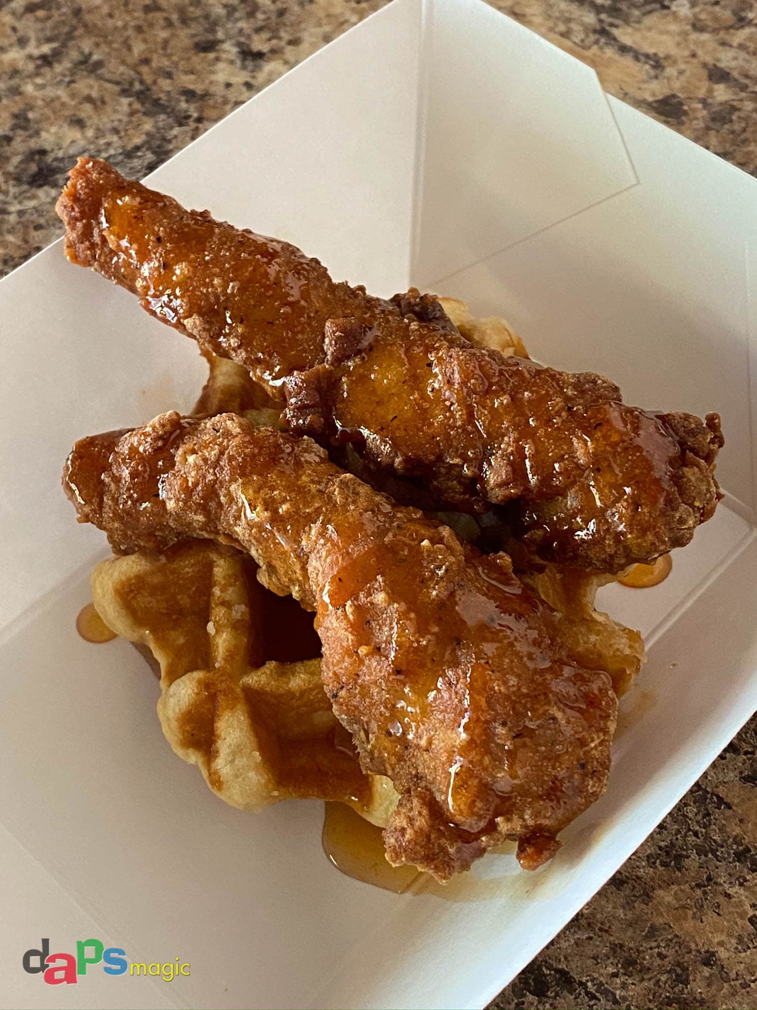 - Boysenberry Breaded Chicken Tender on a Waffle with Fire Honey