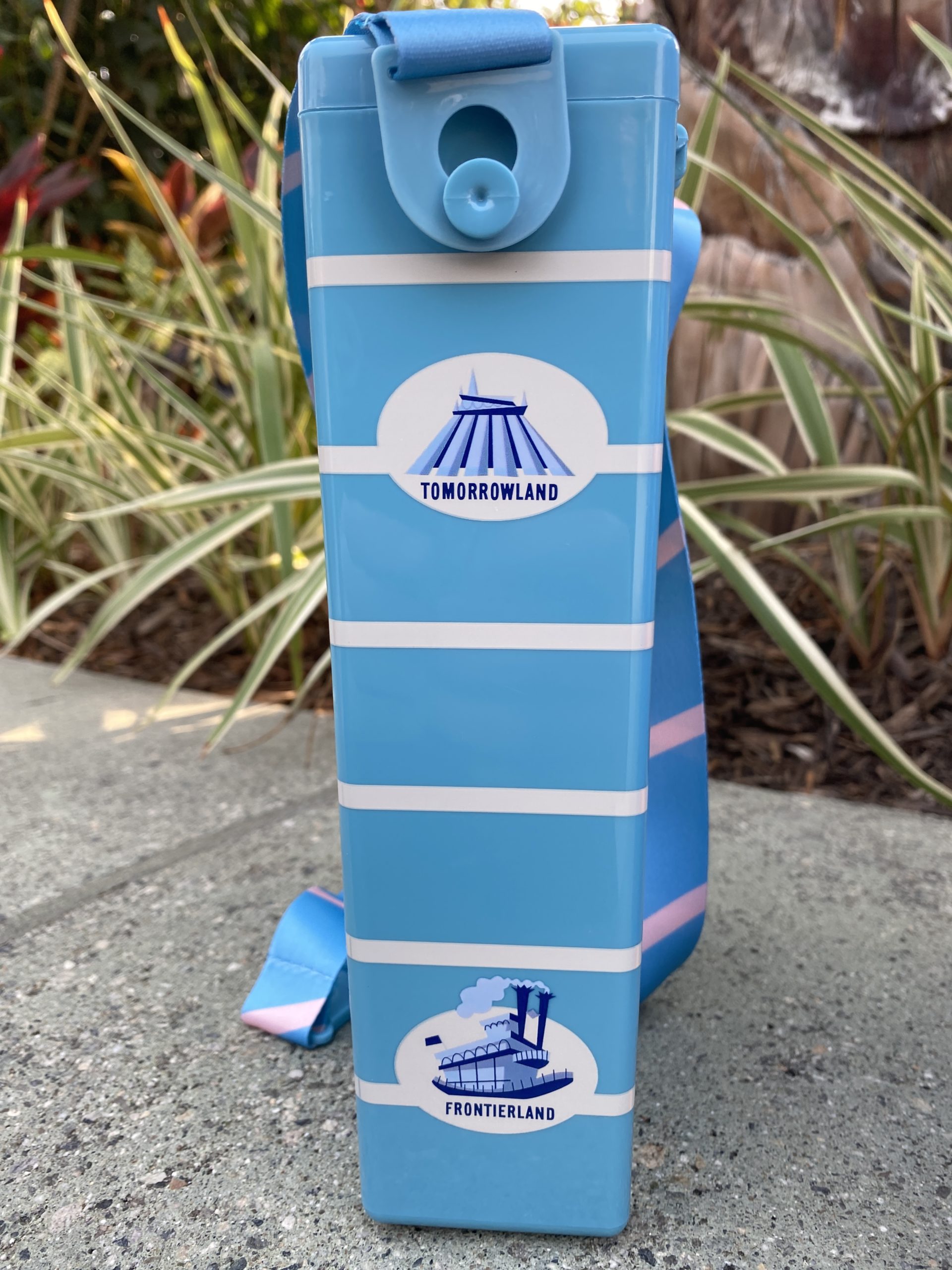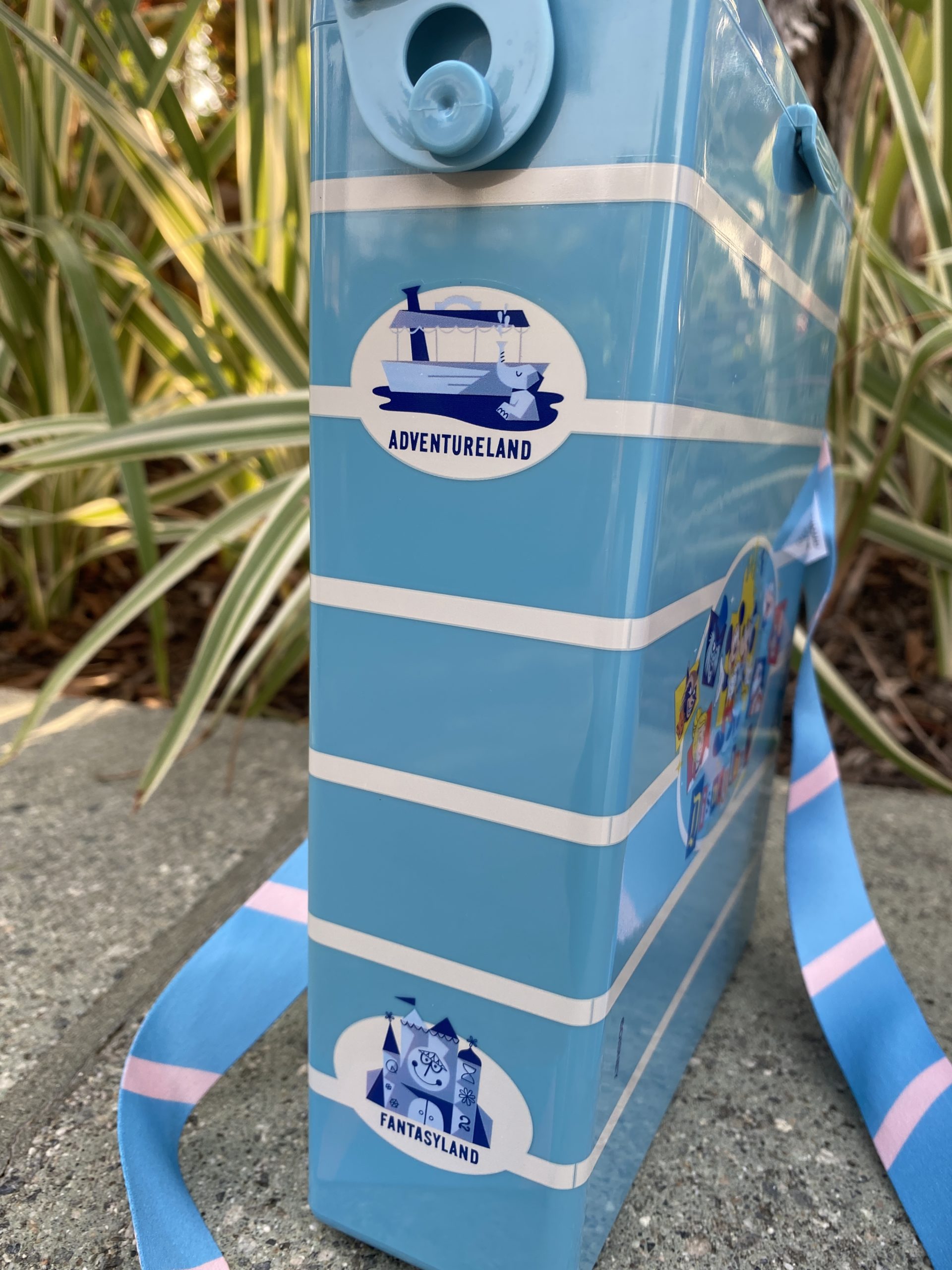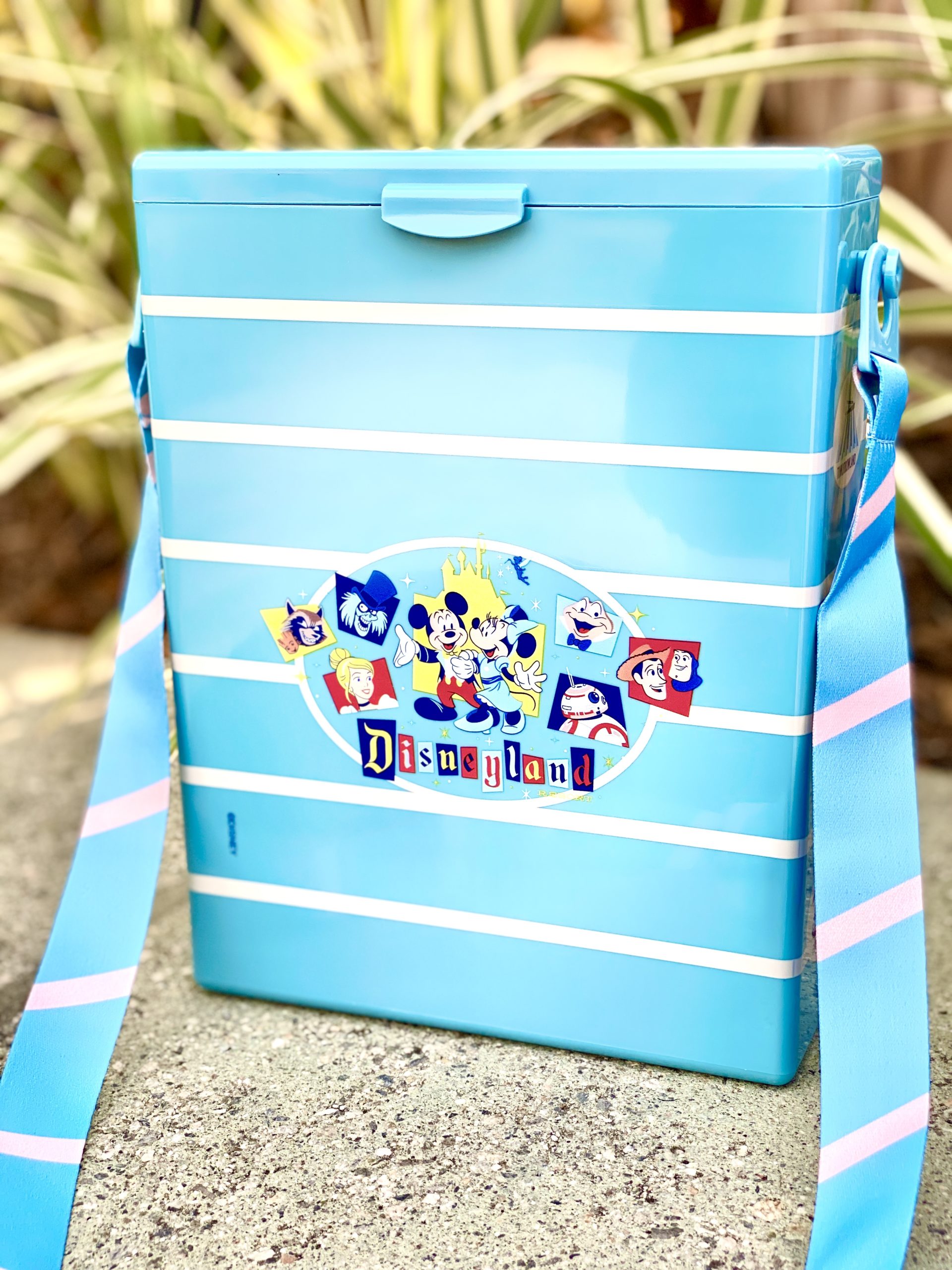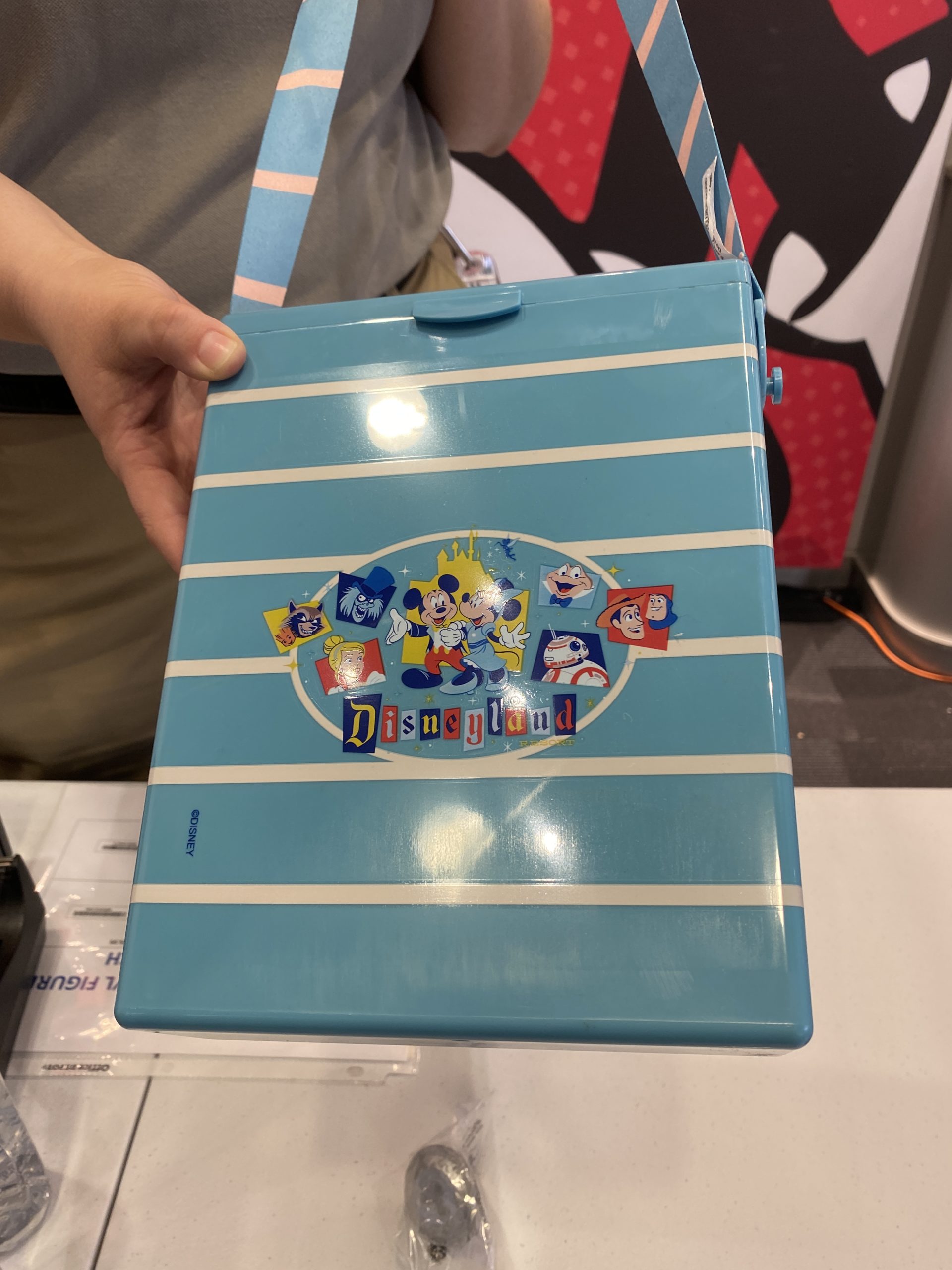A popcorn bucket in the style of the first park popcorn holders was for sale. It featured the 65th-anniversary logo on the front and symbols of the lands on the sides. A nice strap adorns the sides as well. The bucket is a bit different from even the character shaped ones in the park in that it has a box shape to it.