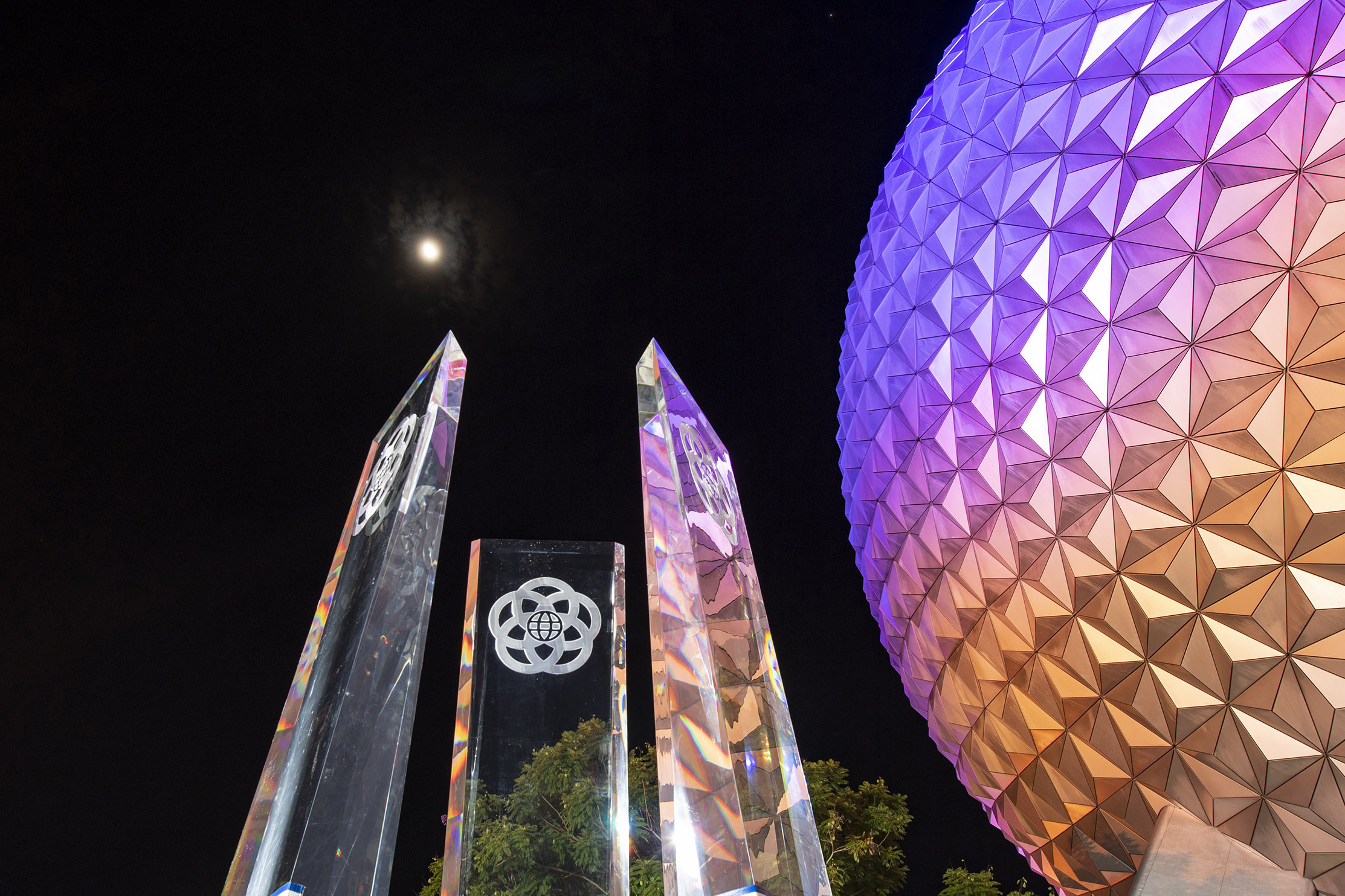 The new changes can be seen right from the start as guests enter EPCOT through the main entrance plaza and enter World Celebration. Earlier this year, new pylons were installed in front of Spaceship Earth as part of the new entrance plaza project. This new fountain, and accompanying lighting package, will be completed by the end of the year. With the new lighting package for the new fountain will also come a new lighting package for Spaceship Earth as well!