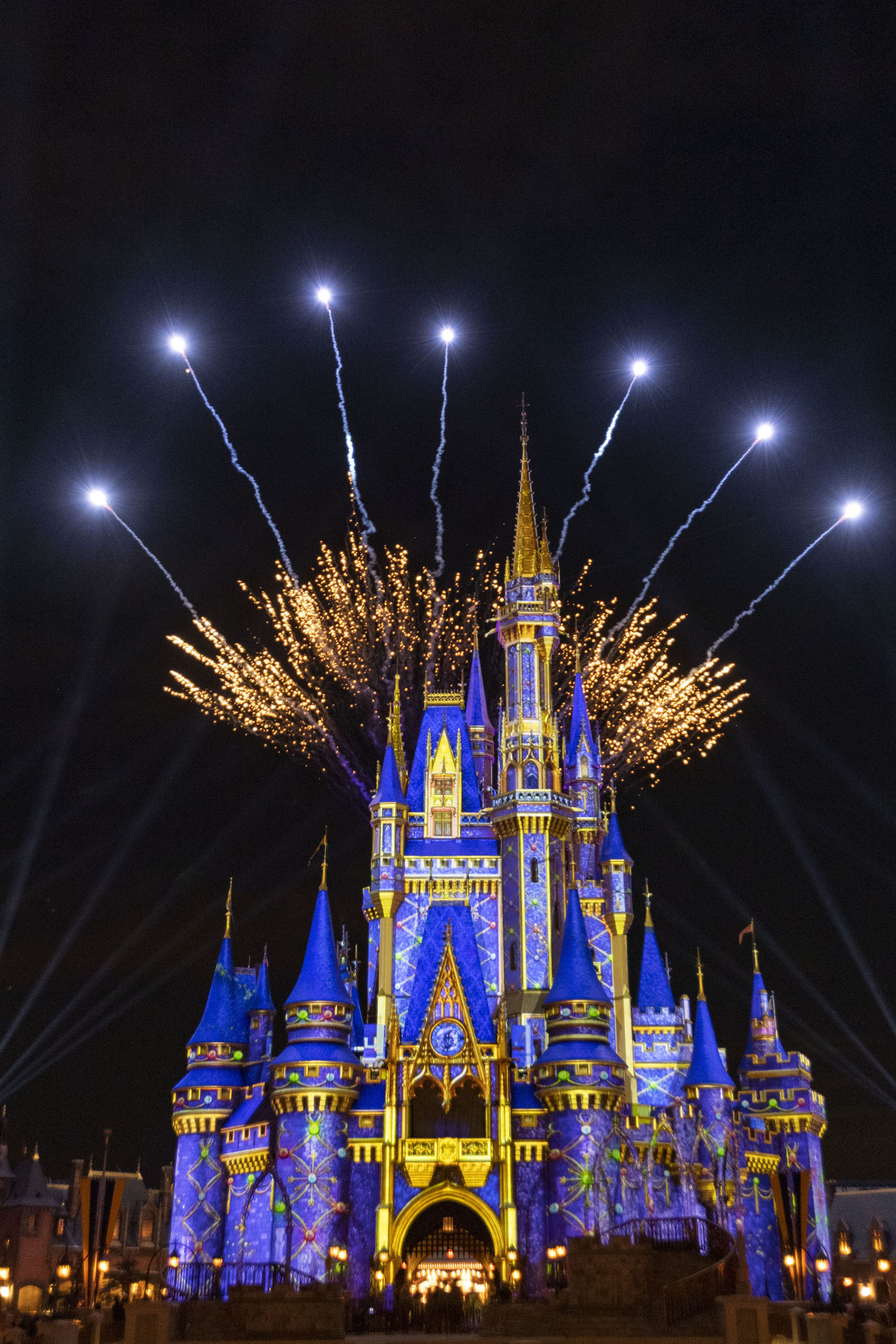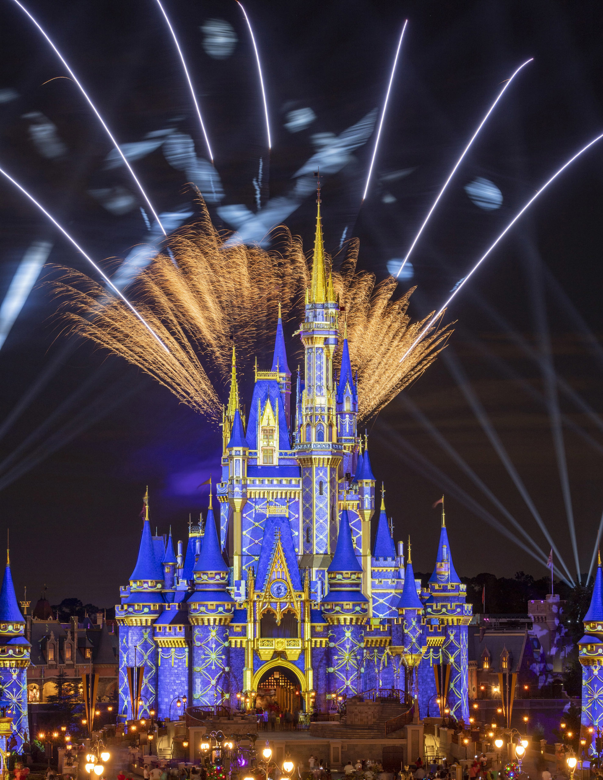 \Pyrotechnic pixie-dust moments add occasional bursts of merriment each night at Magic Kingdom Park as projection effects transform Cinderella Castle with a flourish of holiday cheer. These magical holiday touches occur throughout the night as part of the seasonal celebrations happening across Walt Disney World Resort in Lake Buena Vista, Fla., through Dec. 30, 2020. (Kent Phillips, photographer)