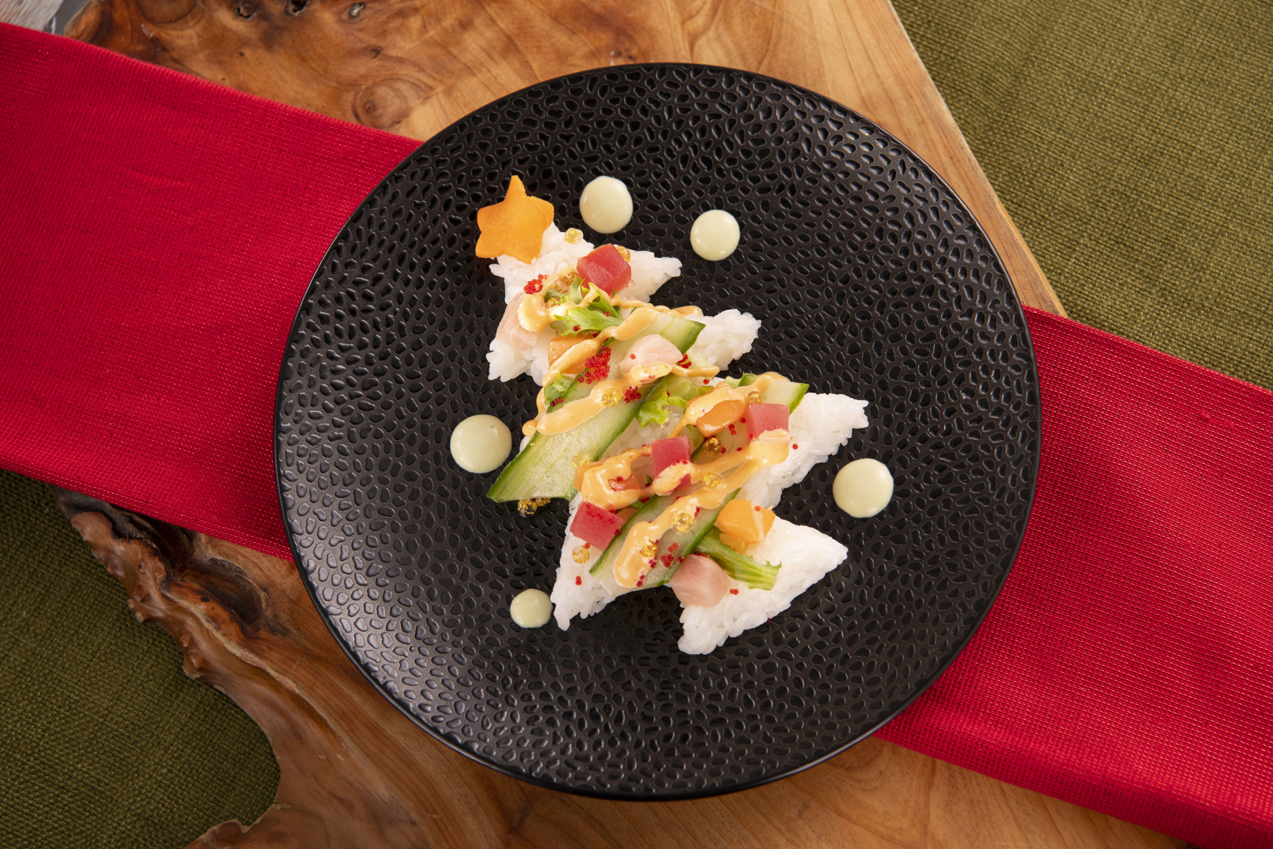 - Chirashi Sushi Tree: Sashimi-grade Tuna, Salmon, Ikura, and Yellowtail with Vegetables decorated on a bed of Rice