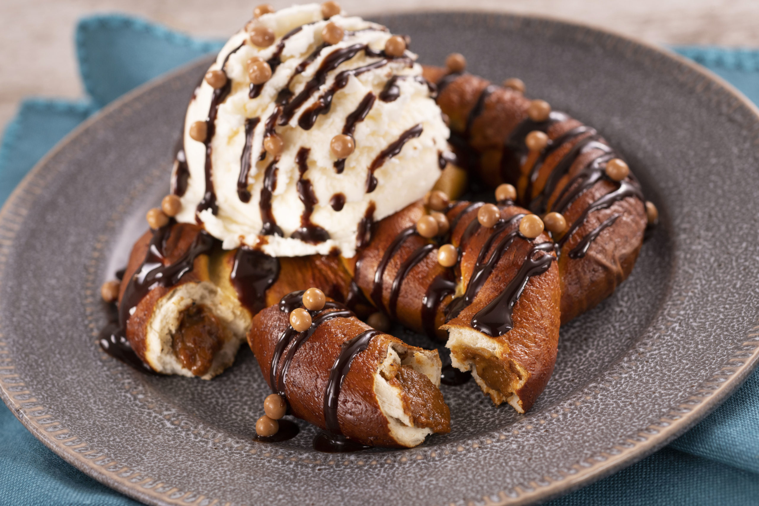 - Warm Brown Sugar-stuffed Pretzel with Soft-serve Ice Cream and Chocolate Sauce