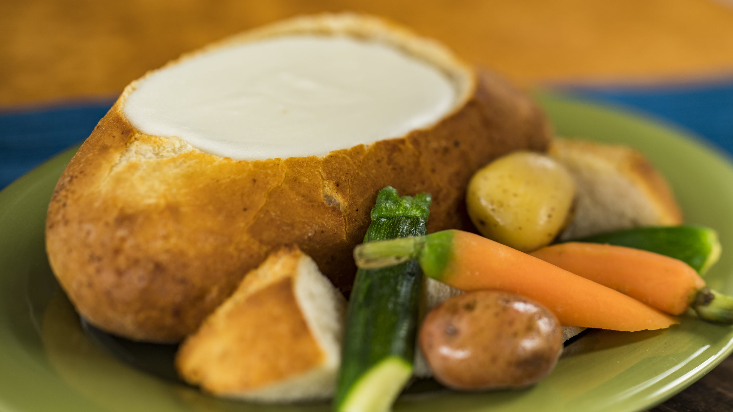 - Cheese Fondue in a Bread Bowl with Steamed Baby Vegetables and Marble Potatoes