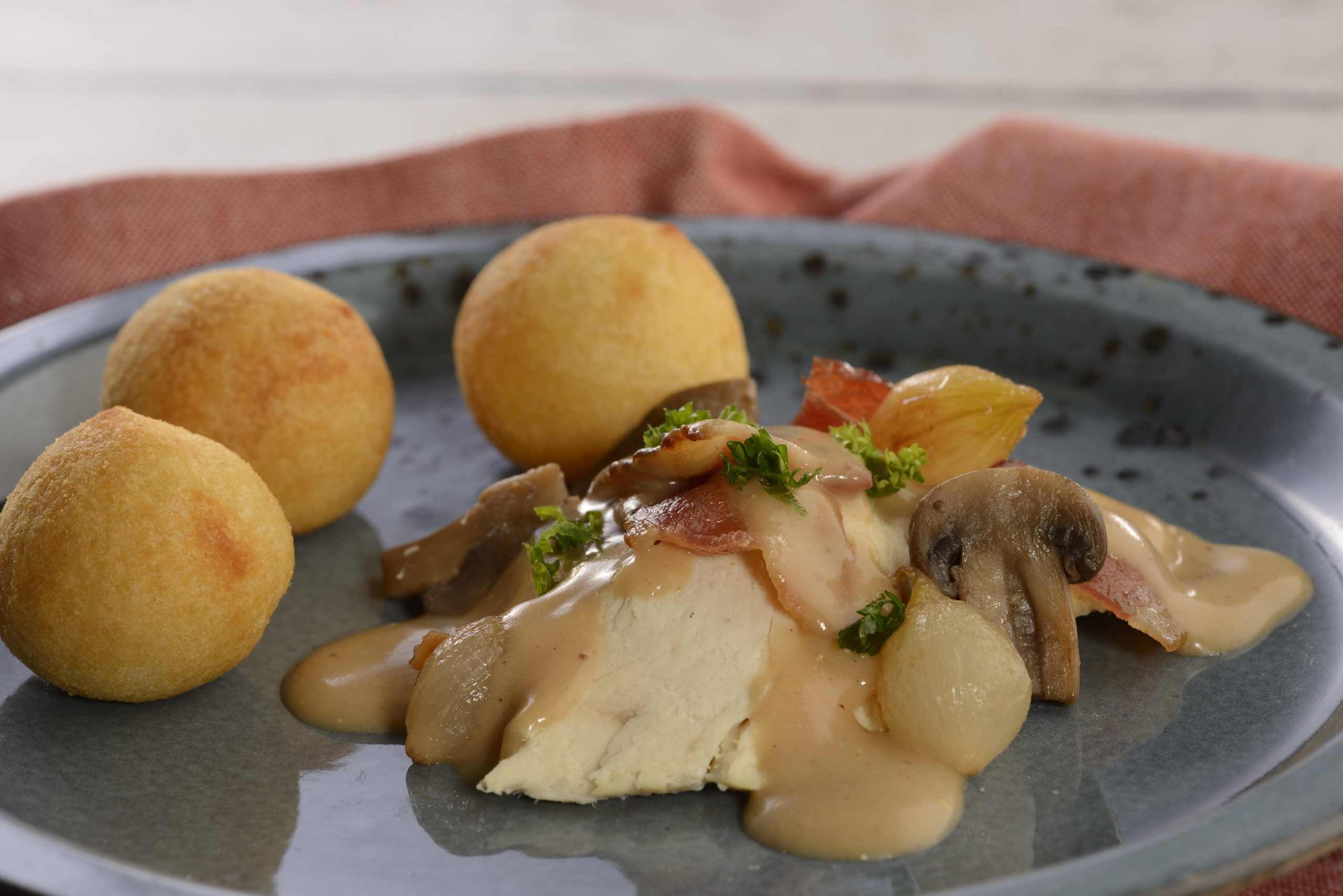 - Dinde Forestière, Pommes Dauphines: Turkey with Bacon, Mushrooms, and Onions in a Mustard Cream Sauce with Puffed Potatoes (New)