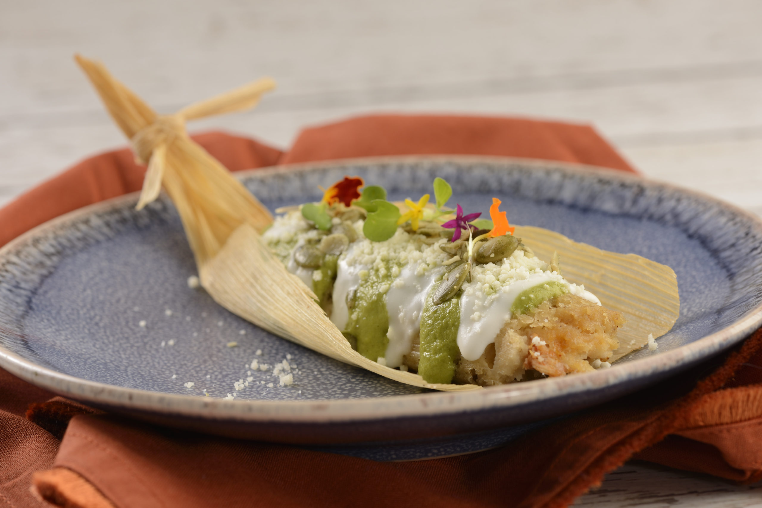 - Tamal de Pollo: Braised Chipotle Chicken served in a Corn Masa topped with Mole Verde, Queso Cotija, Crema Mexicana, and Toasted Pumpkin Seeds (Gluten/Wheat Friendly)