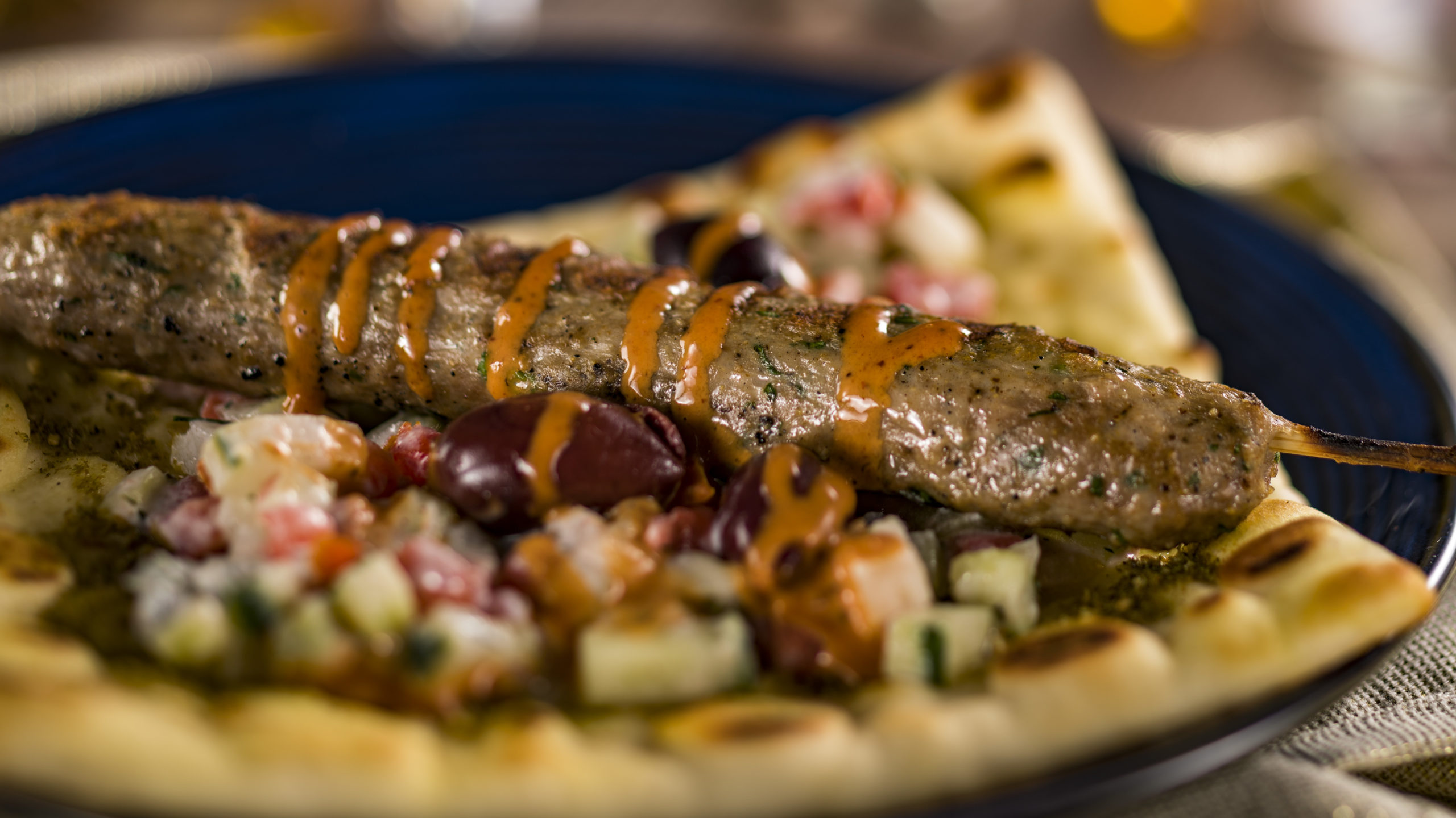 - Grilled Lamb Kefta Kebab and Grapes with Euro Cucumber, Red Pepper, Pickled Pearl Onions, and Harissa-Cilantro Dressing
