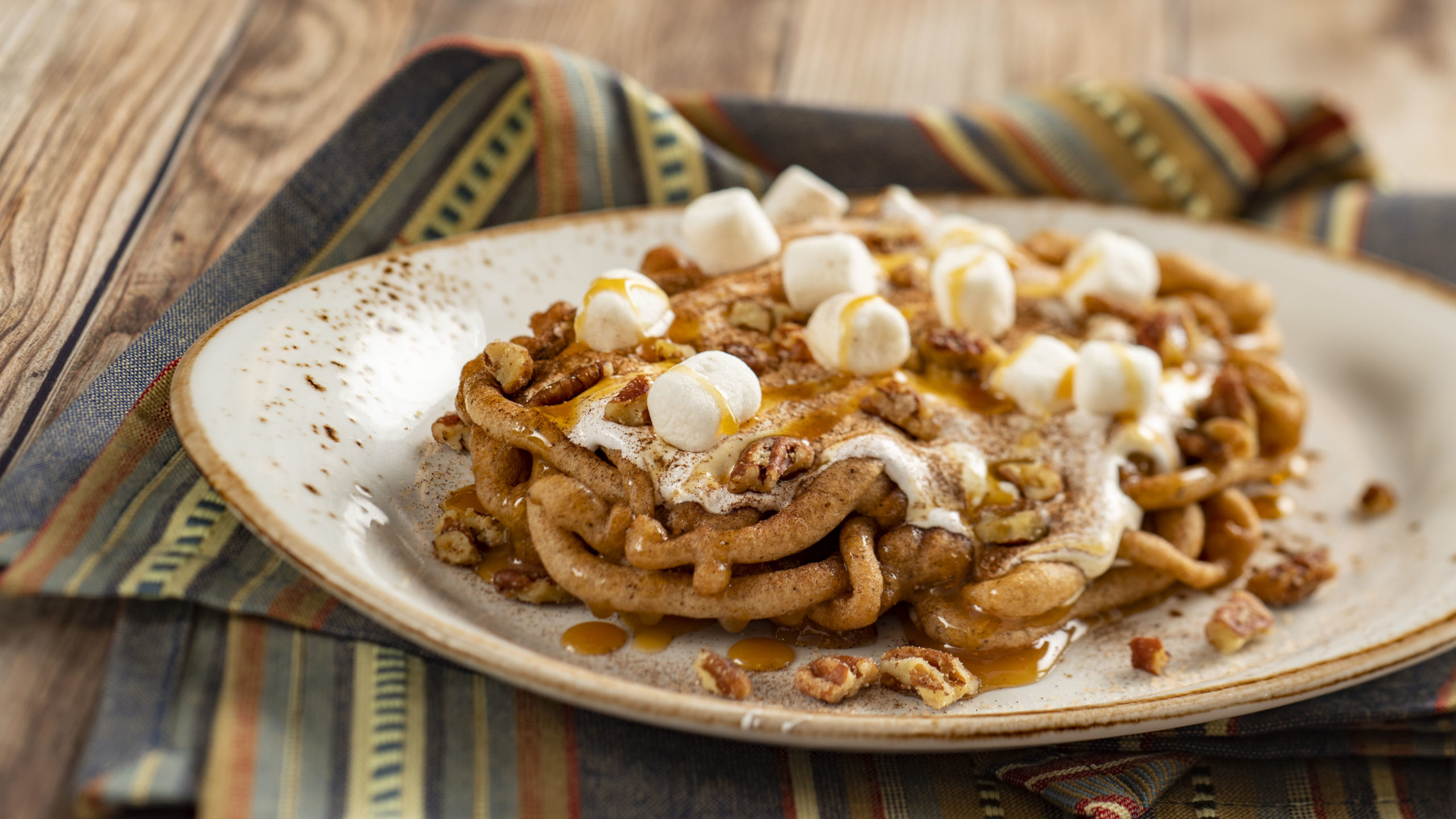 - Sweet Potato Casserole Funnel Cake topped with Marshmallow Topping, Cinnamon-Sugar, Honey-roasted Pecans, and a Caramel Drizzle (New)