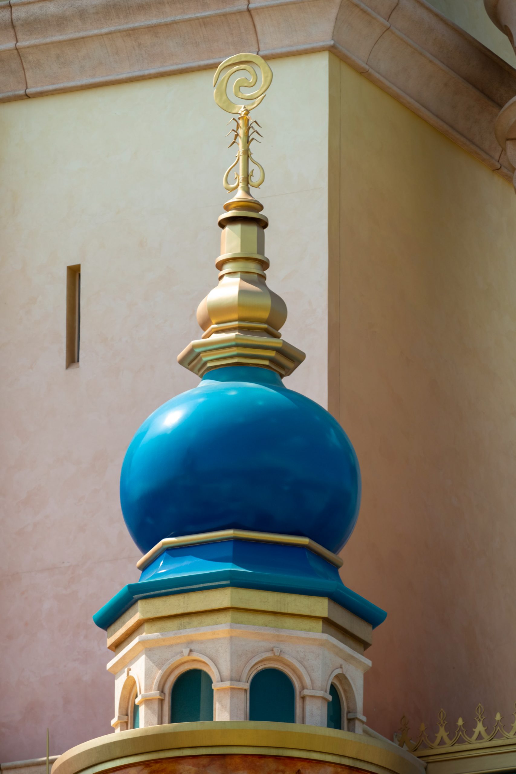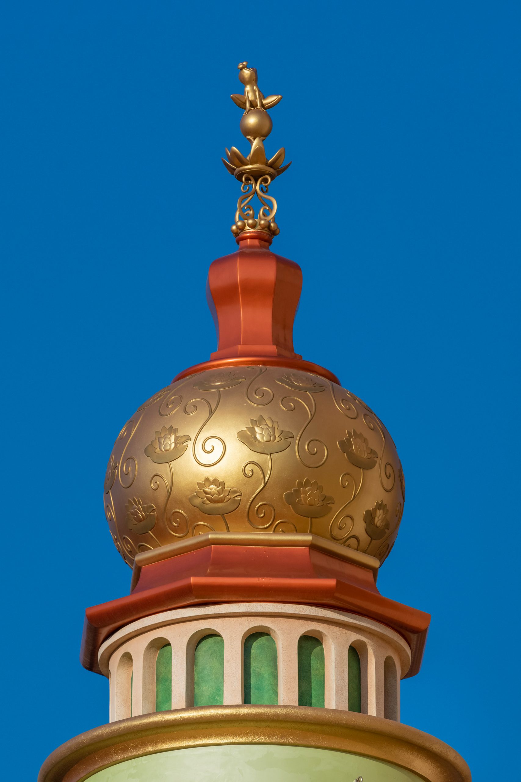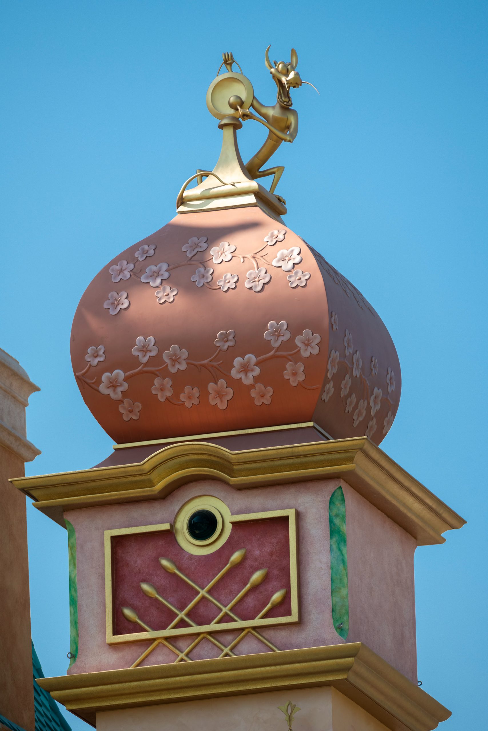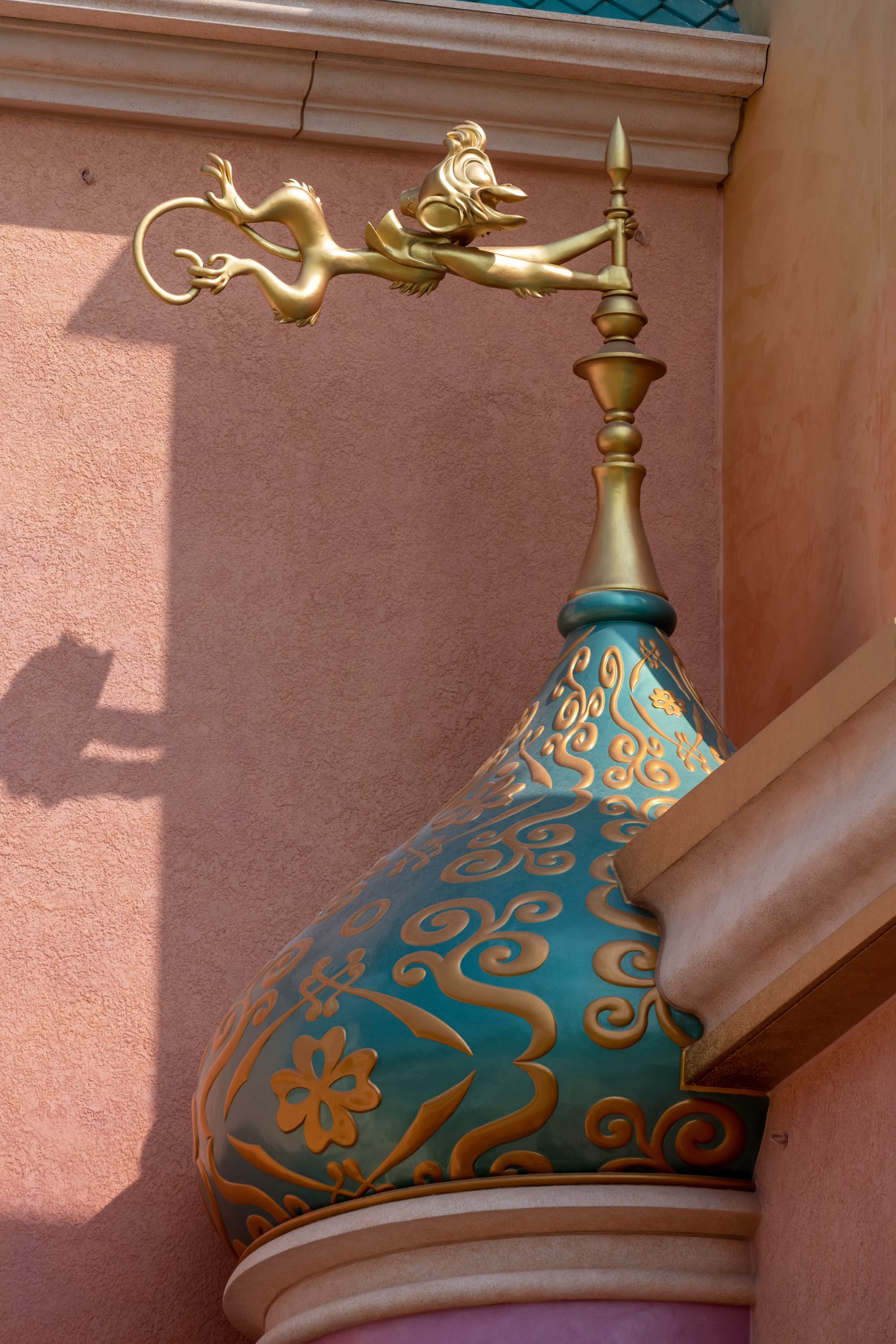 - The golden finial that tops Jasmine’s dome depicts Abu playfully hanging onto the decorative spire as if caught in the wind.