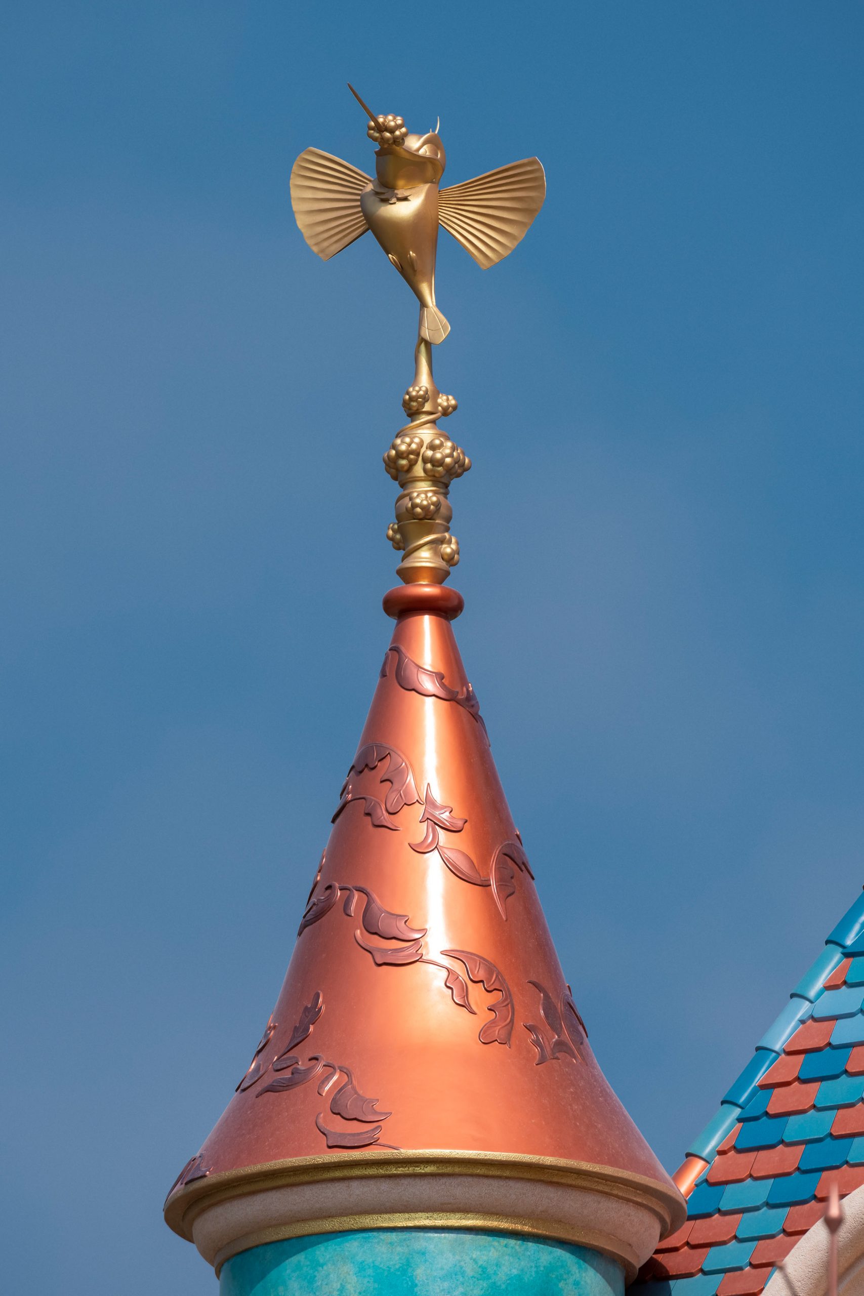 - The golden finial on top of the turret features her devoted hummingbird companion, Flit, withraspberries stuck on his thin, needle-like beak.