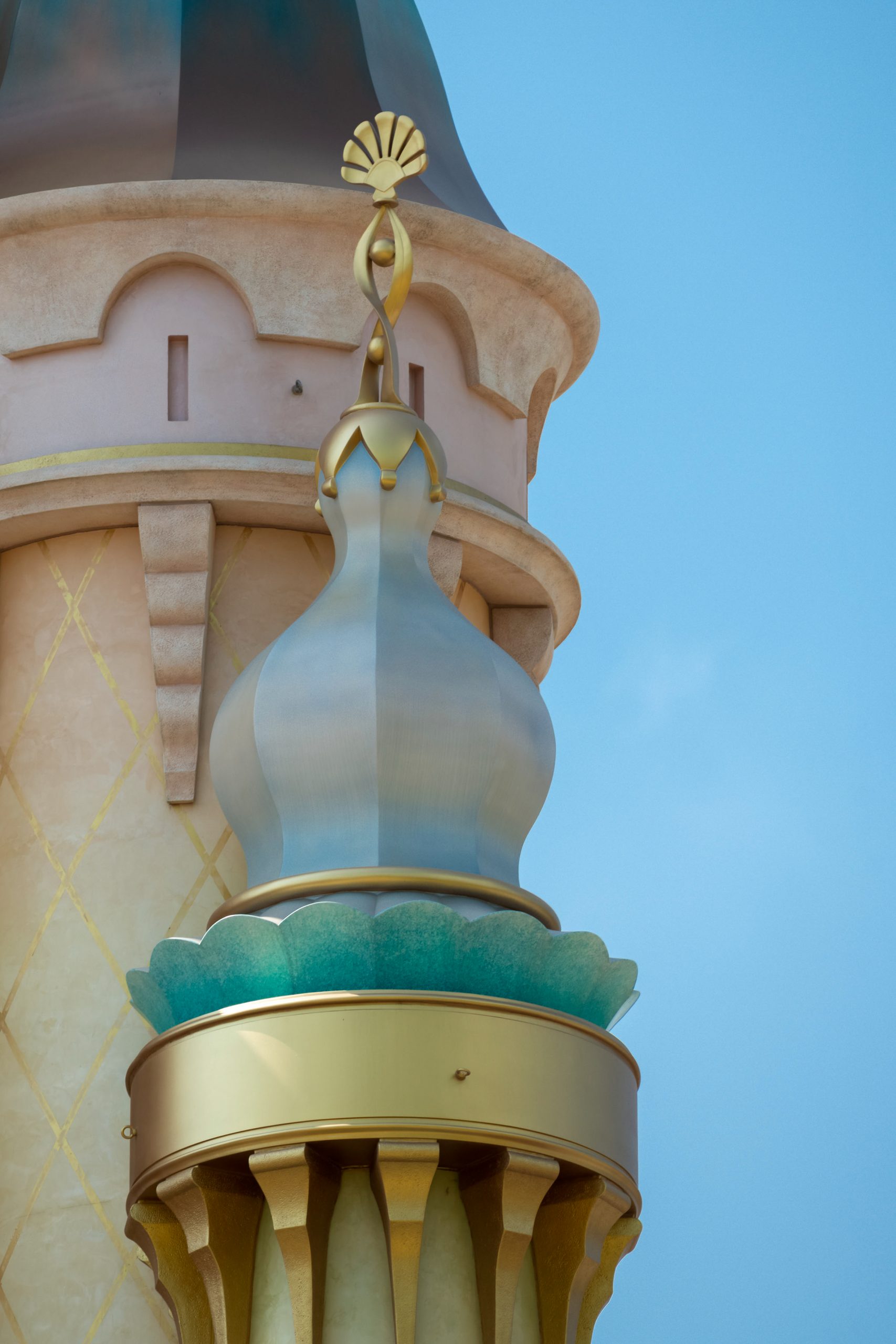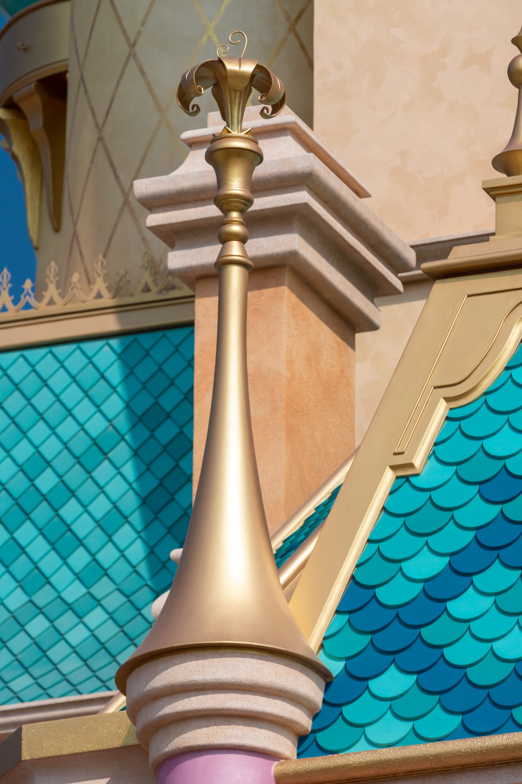 - The color of Ariel’s tower is inspired by her dress, using subtle gradations of coral and green, while thedome features scalloped details with a pearly luster and gold highlights.