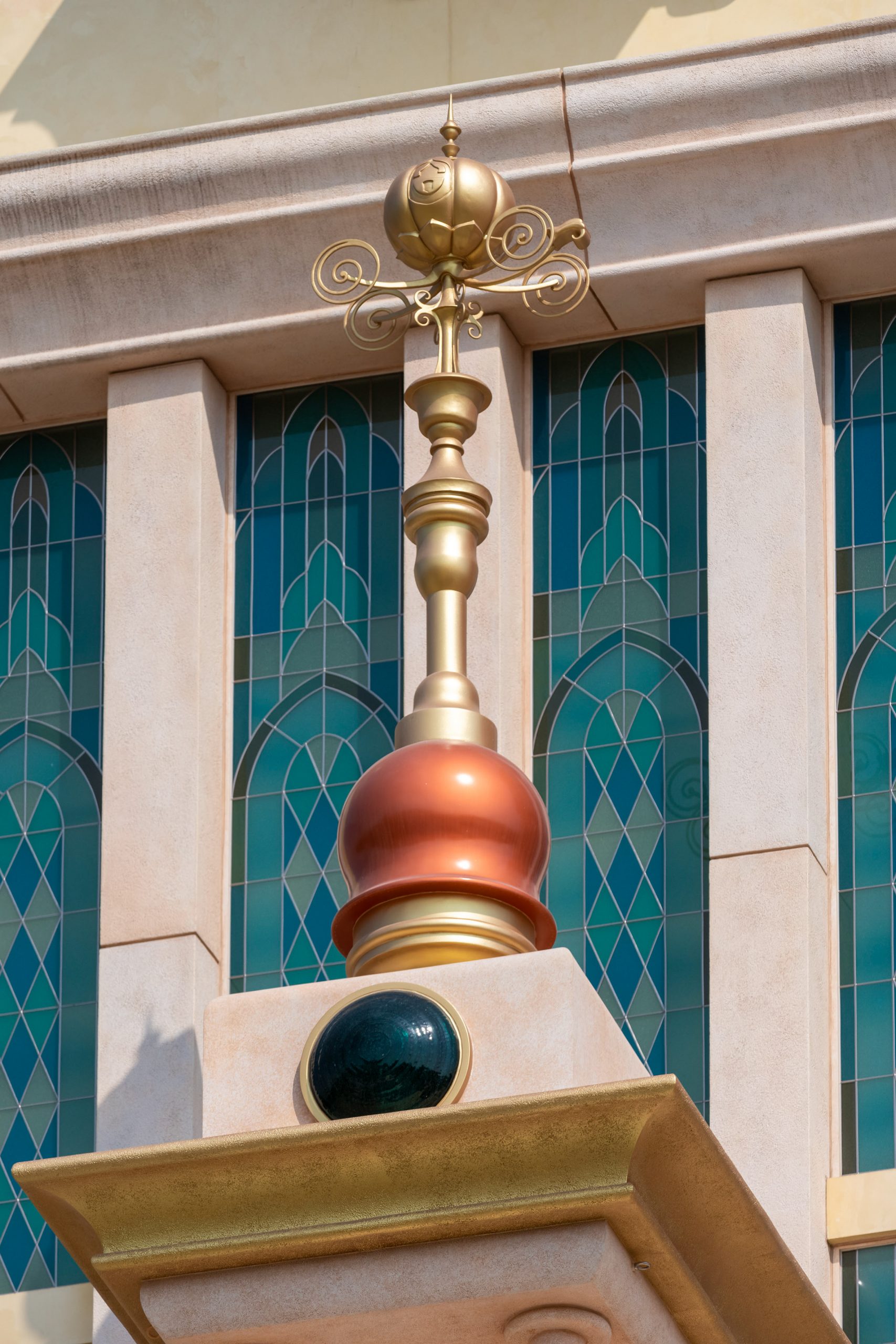 - A golden finial takes the shape of a weather vane featuring her iconic apple positioned on a smallercoppery-red dome. This represents the poisoned apple given to Snow White by the Evil Queen, serving as the catalyst of Snow White’s enchanted sleep.