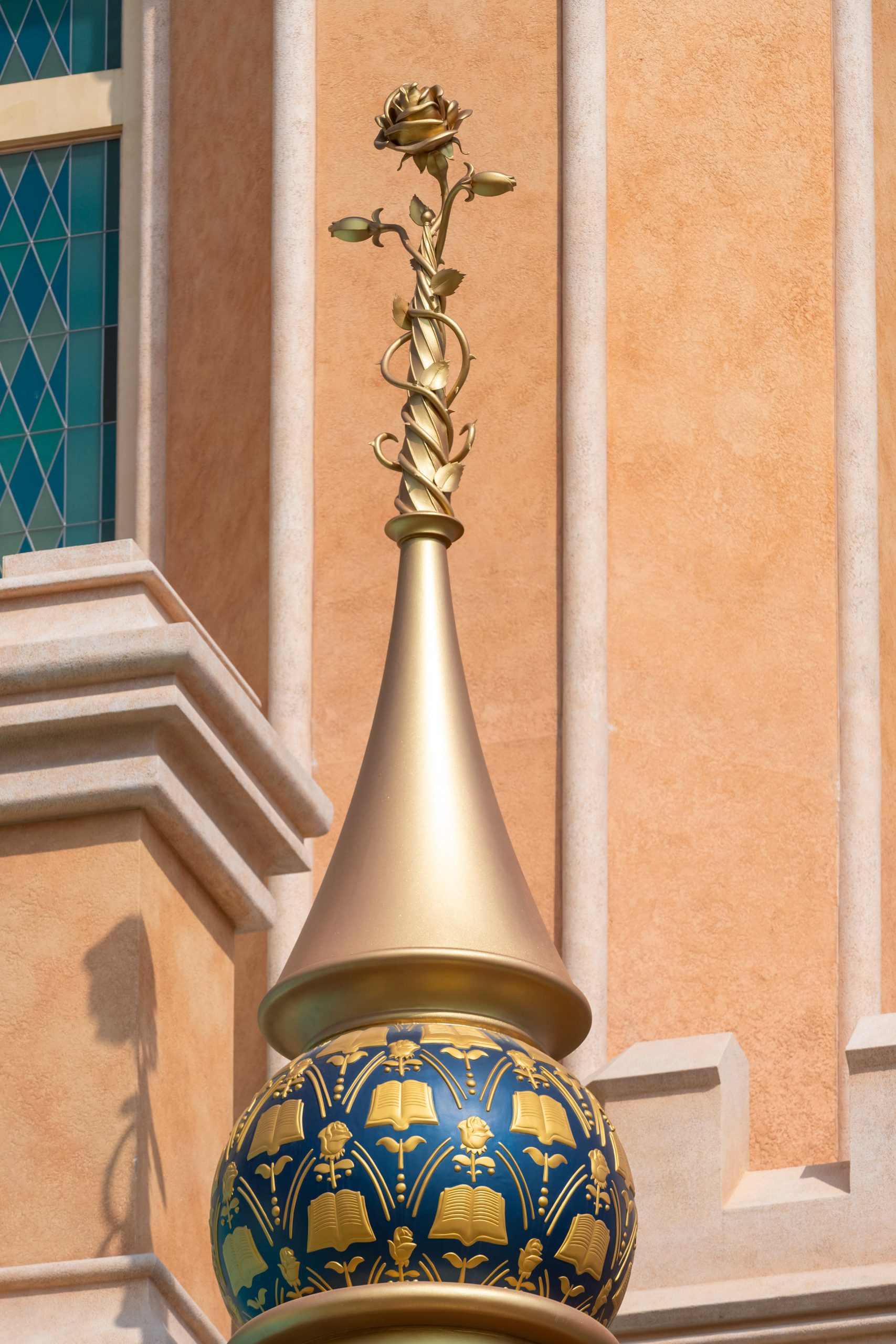 - The golden finial on Belle’s tower depicts the enchanted rose from Beast’s castle.