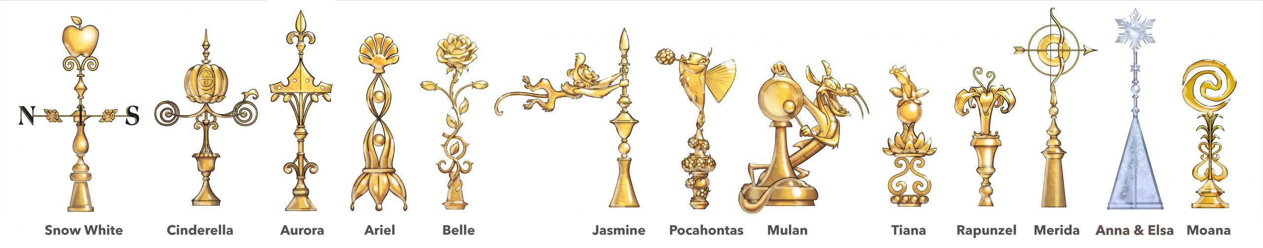 - The finial atop the tower features a shimmering golden crown that alludes to Aurora’s title and responsibility as a princess.Ariel: Ariel is the spirited and curious mermaid who finds herself enchanted by all things human.