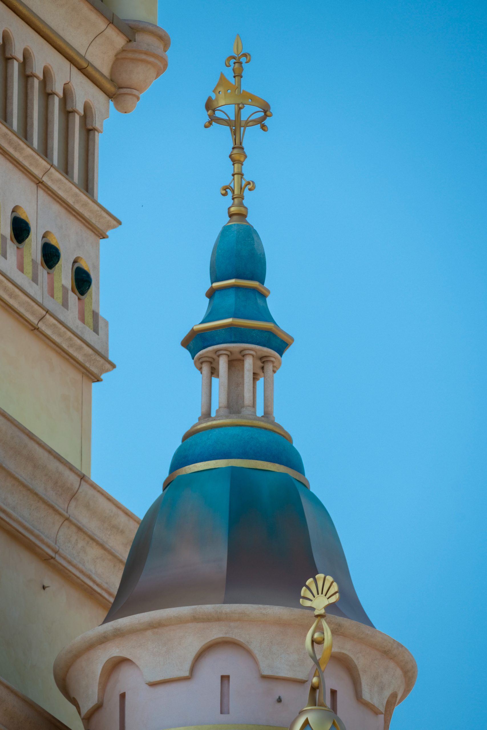 - Her tower features a turquoise dome with a golden pattern that includes sword-like shapes.