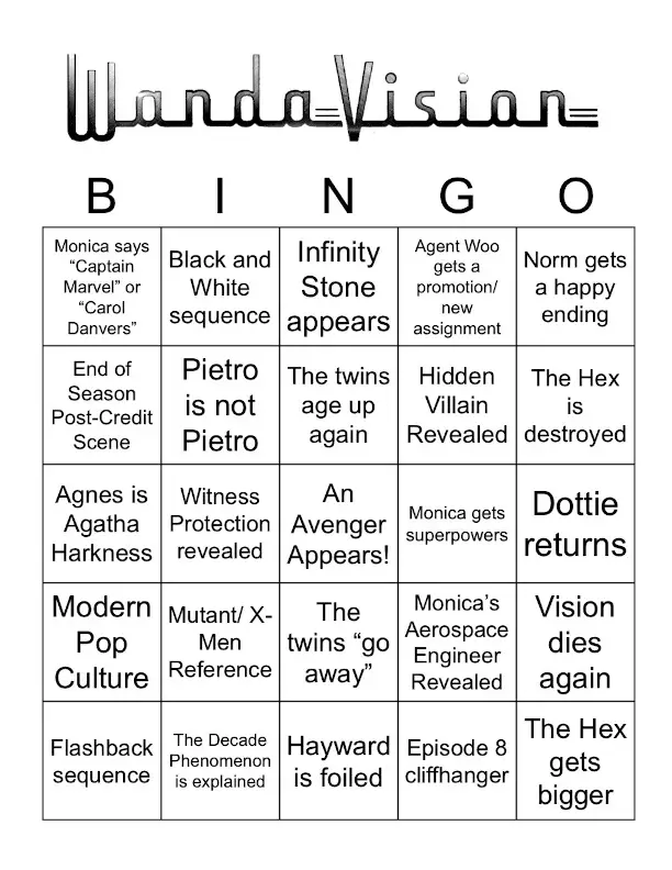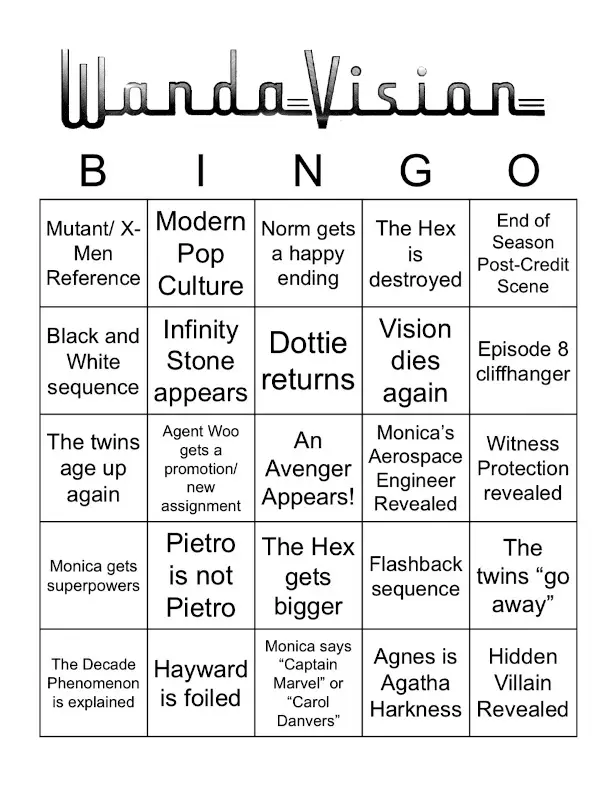 Fans of WandaVision have been so eager to determine exactly what will happen next (as well as… what just happened?) that any number of plausible scenarios have been presented. Some are very far-fetched (Vision’s actually a Skrull!) to the almost certain (an Avenger appears!). In the spirit of speculation, we humbly present an interactive diversion for the last three episodes: WandaVision Bingo.
