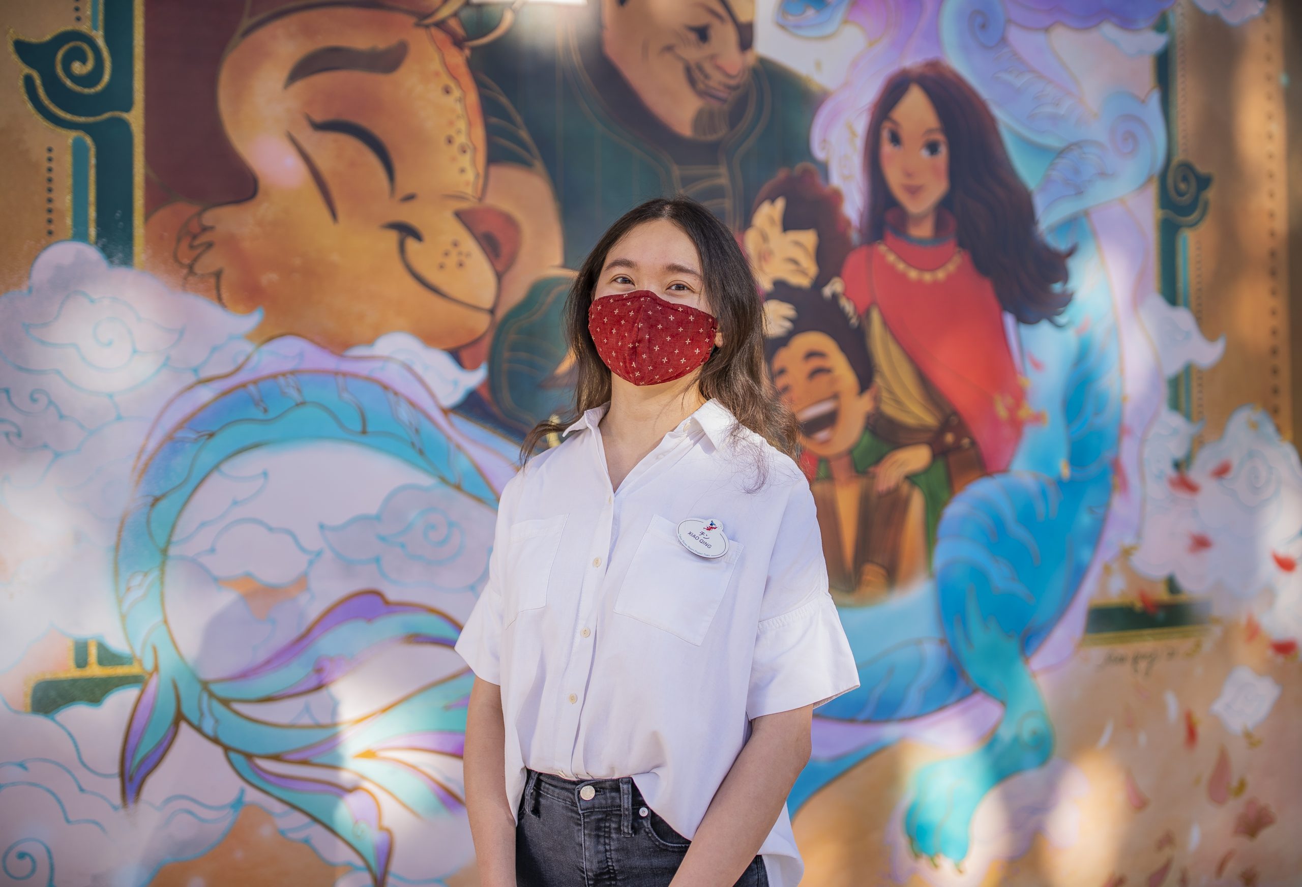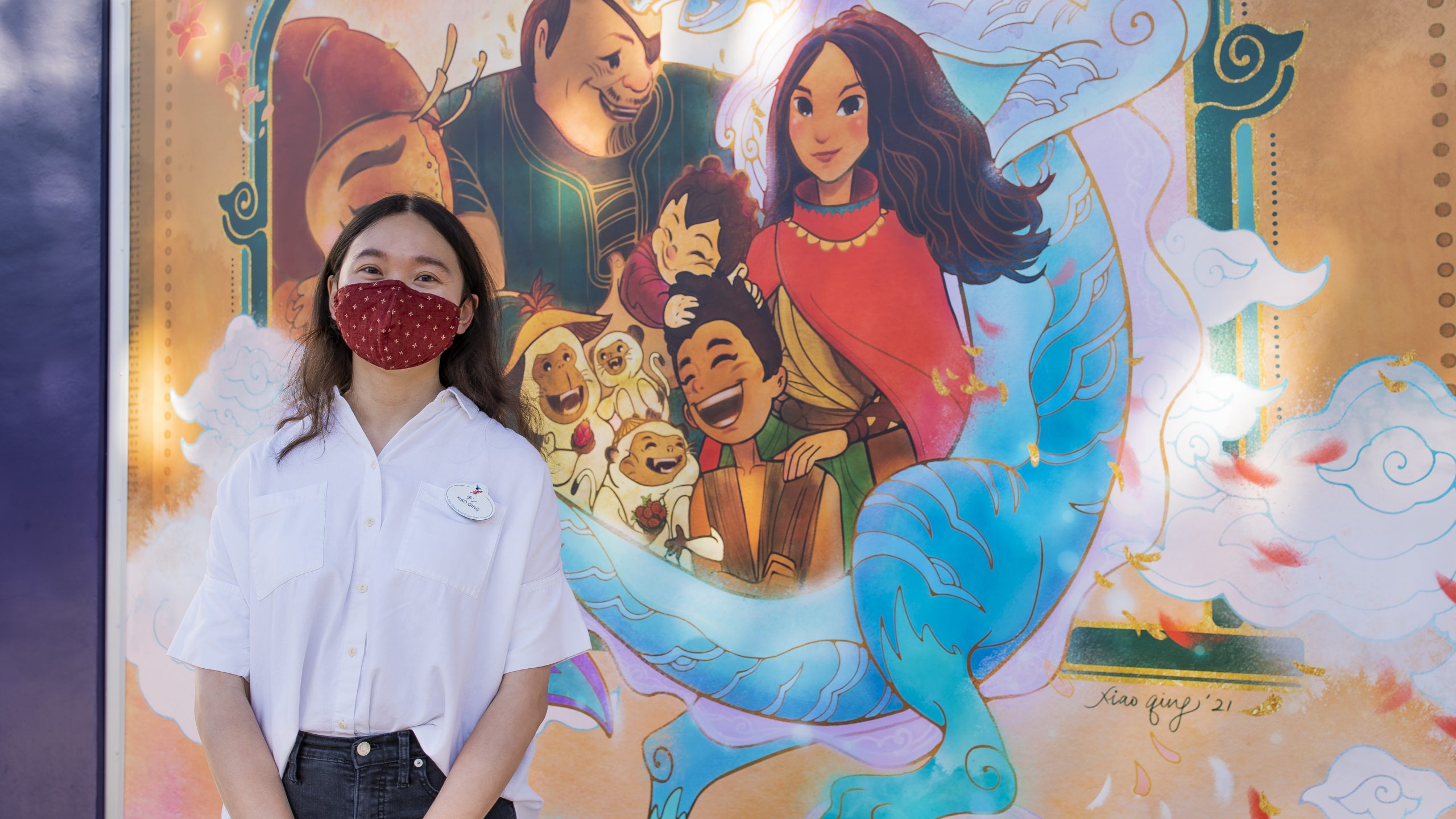 Qing was born and raised in Malaysia. This gave her the opportunity to share an authentic cultural perspective in the design of this artwork. She shared with the Disney Parks Blog that the “piece is loosely inspired by the art of Batik, the design of fabric using hot wax, dyes and stamps, commonly used in the Southeast Asian region. The linework in this piece depicts traditional hot wax techniques that isolate areas for vibrant colors. With variations in line weight and touches of imperfections, I hope to evoke the sense of a handmade textile, connecting the characters as a harmonious unit and encouraging us to accept each other’s imperfections.”