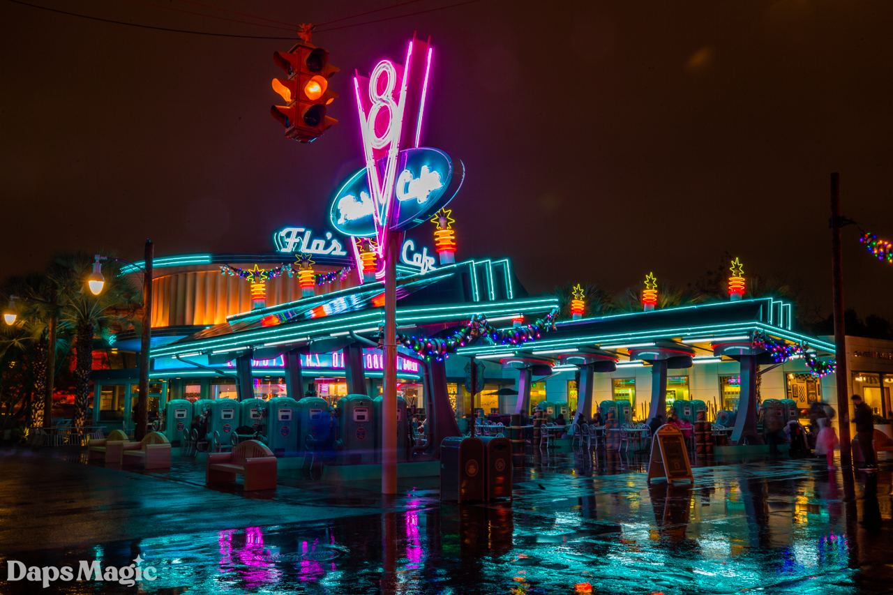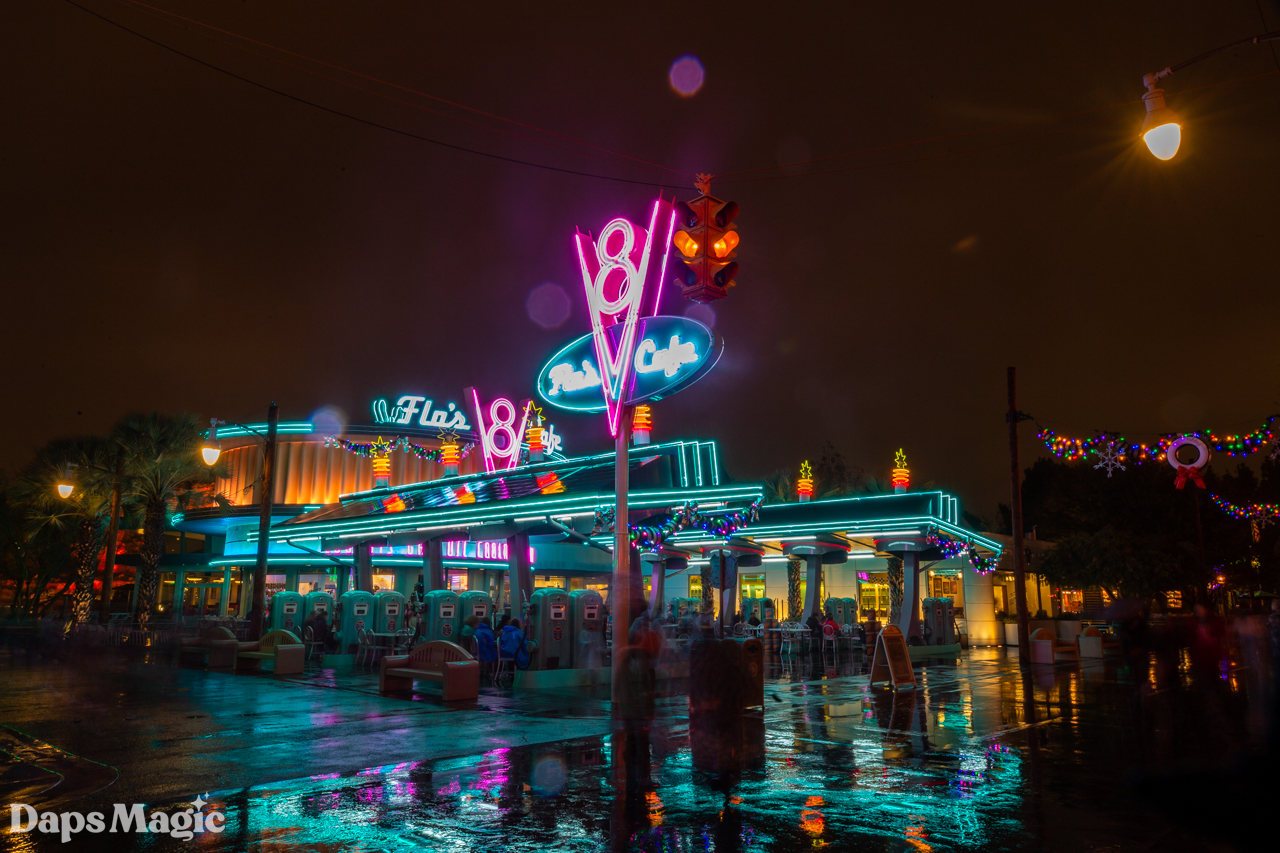 The evening began in Disney California Adventure with a stop by Paradise Gardens to see Phat Cat Swinger. As the band began their sound check the rain began to come down and soon the band was gone, the tarps were out, and a different kind of magic was being made at the Disneyland Resort. As the rain came down, it was decided that we would wander wherever we felt inspired to go. The first stop was in Cars Land. At this point, the rain was also blowing, and keeping a lens clear was incredibly difficult.
