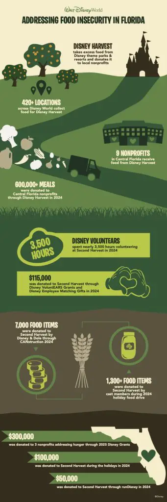 - In 2024, Disney made a $150,000 donation to the Second Harvest Food Bank of Central Florida, which enabled the creation of approximately 600,000 meals for Central Florida families. The resort gave an additional $500,000 to Second Harvest that year in the wake of Hurricane Milton to help feed families in crisis after the storm.