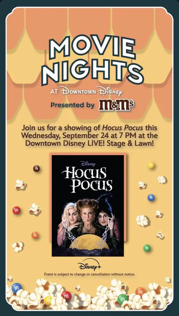 At this time, most of the movies that will be shown have not been announced. The first movie on September 24, 2025, will be Hocus Pocus. The following was shared on Stories on the Downtown Disney District Instagram: