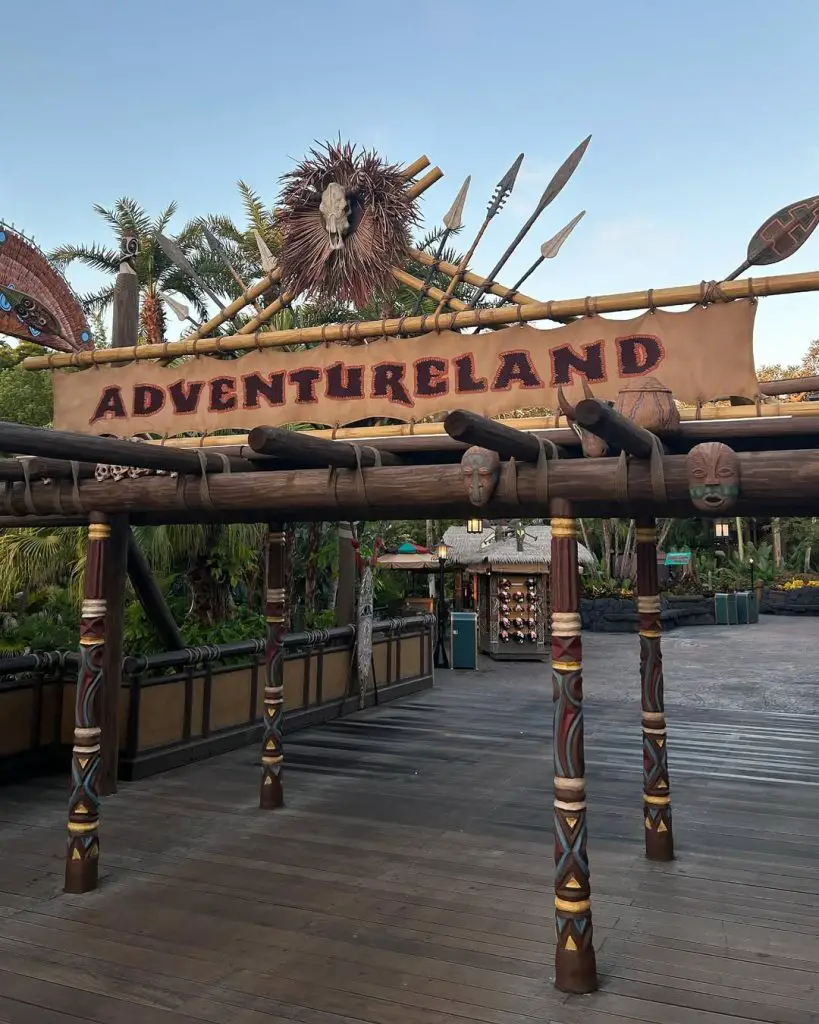 The Adventureland marquee at Magic Kingdom now welcomes explorers with refreshed props and a hand-stitched fabric banner!