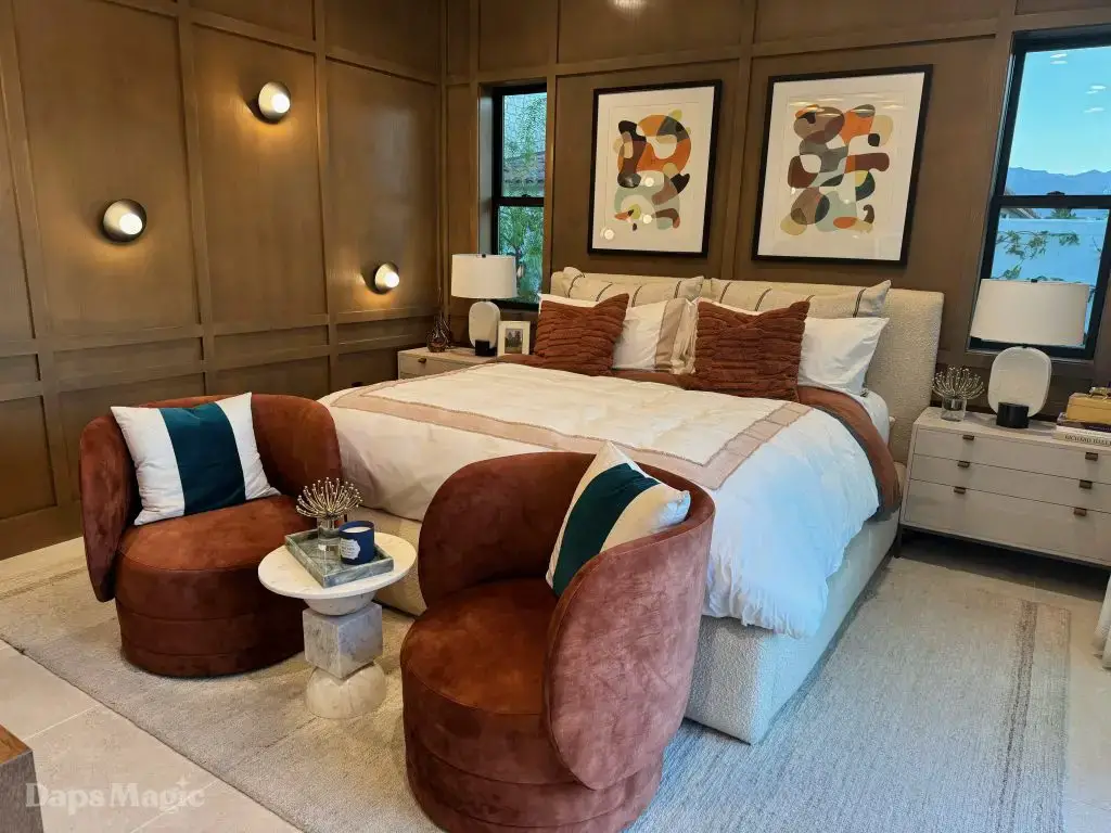 The first home was the mid-century modern Atelier model from Shea Homes. This house had such a great vibe! Walking into the house, it was hard to not smile. This lovely house utilized every inch of space wisely. The kitchen was one I would love to cook in. The bedrooms had lovely feels and the backyard felt like a great space to entertain. Currently, some of the angles have lovely views of the mountains that were beautiful as the sun was setting. The bathrooms had plenty of room and the closets were ample.