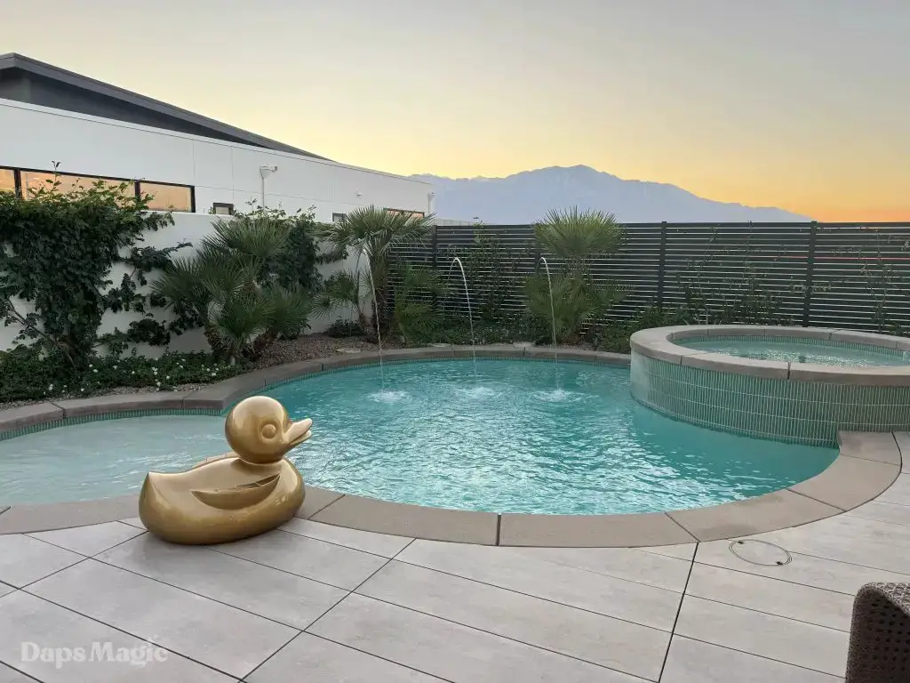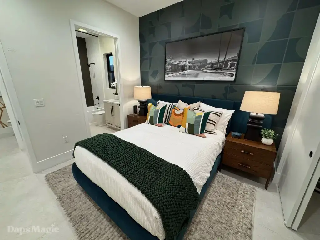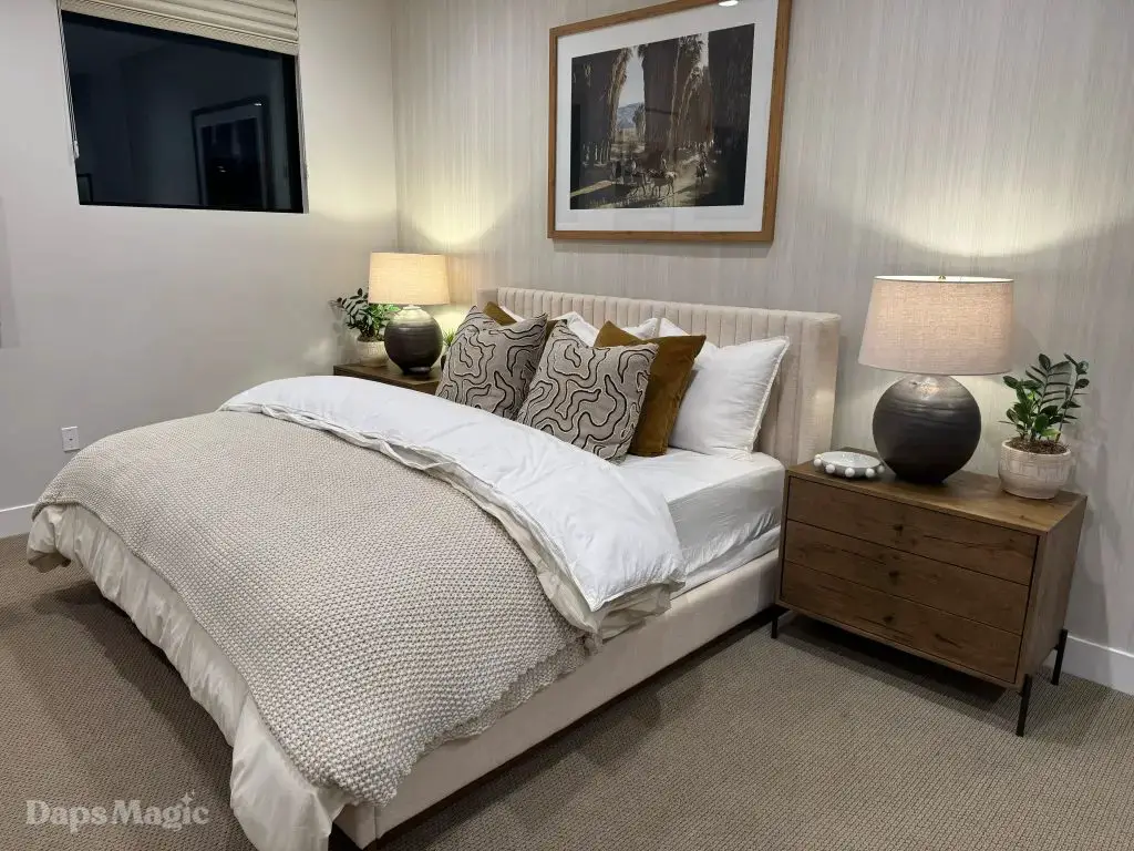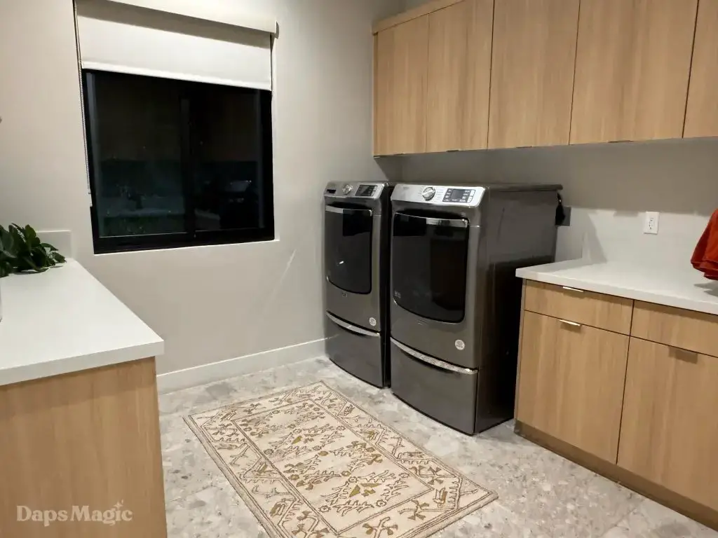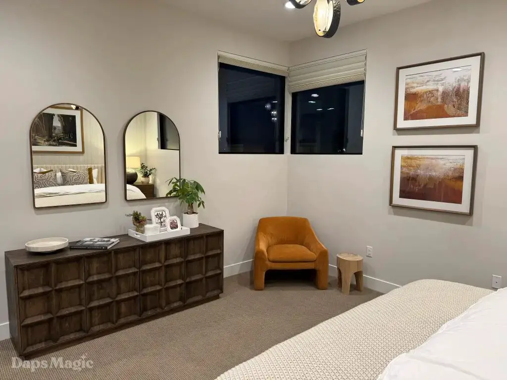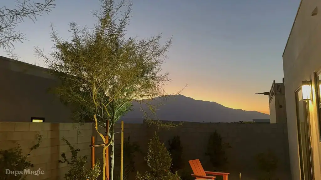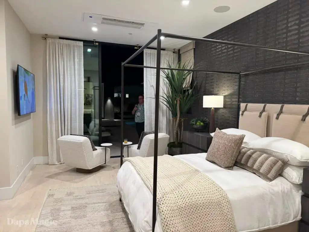 The next stop was the Westwind Model from Woodbridge Pacific Group. Just a quick walk down the street, the sun was setting as the group made its way for dinner at this house. As the sunlight glowed behind the mountains, the whole community felt magical. The area is surprisingly quiet. For as many businesses and houses that are in the general area outside of Cotino, you’d never know. It really is a peaceful place, which I think is a huge selling point in itself. The house itself was really impressive. This house was on a bigger lot and was larger than the first house we visited. It also was more spread out. While it was very different, it also felt like it came from the same community as the first one. There were a lot of features to be found throughout this house. There was a lovely office just inside the front door. On the other side of the entry way, there was a suite that is probably meant to be the primary one. It had a MASSIVE closet, an incredible bathroom (also very large), and a lovely bedroom. Both the bathroom and bedroom had views of the lovely backyard deck and pool. This also had a washer and dryer included in this suite.