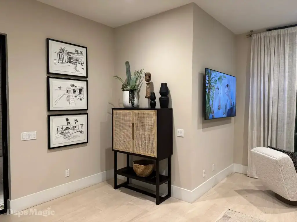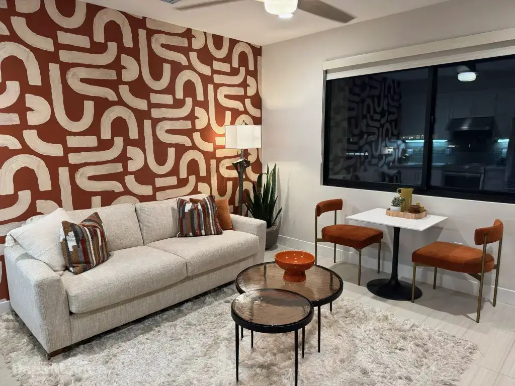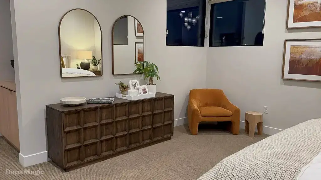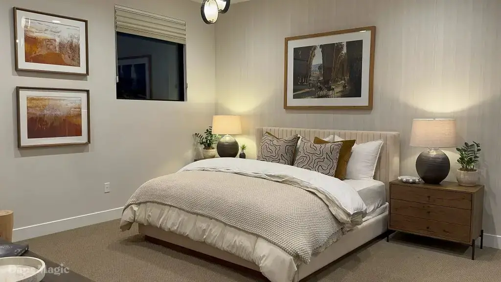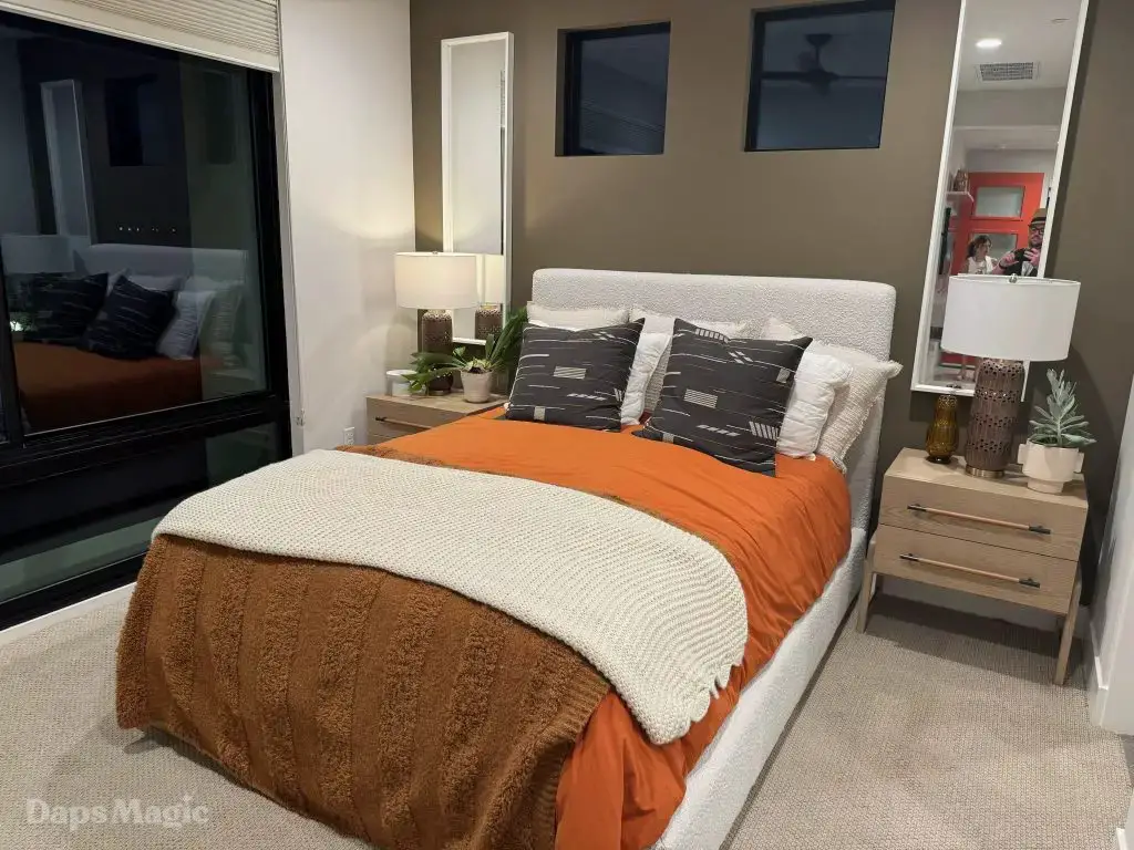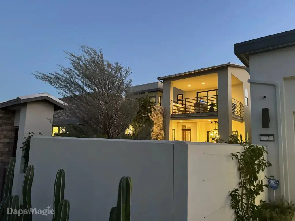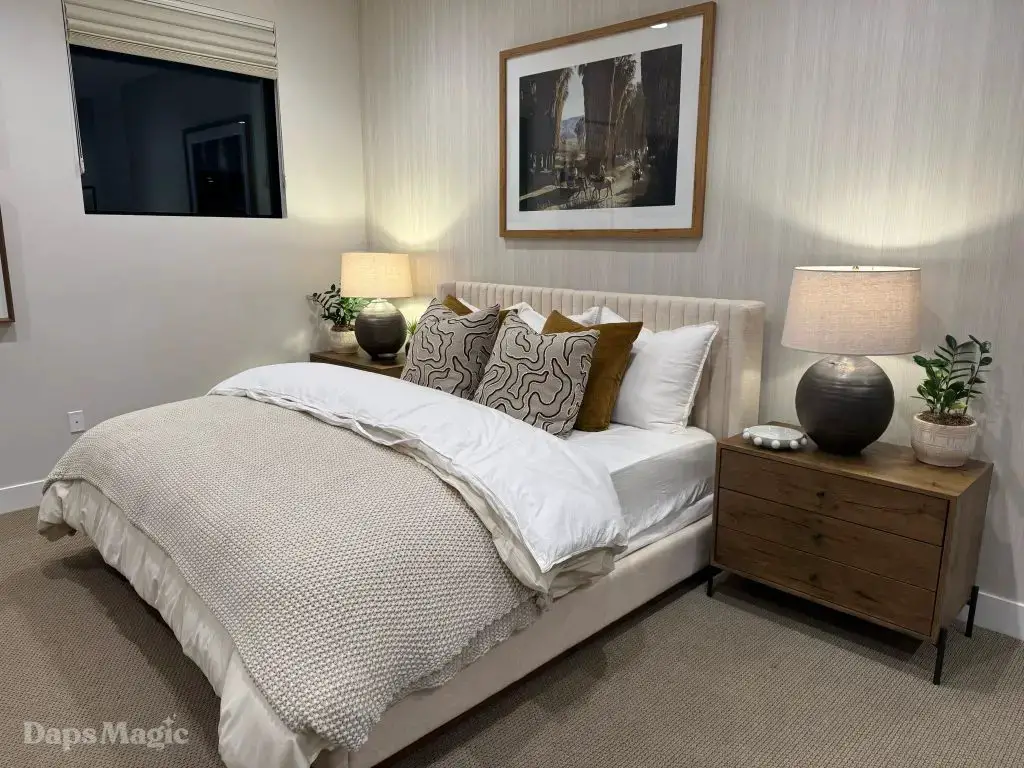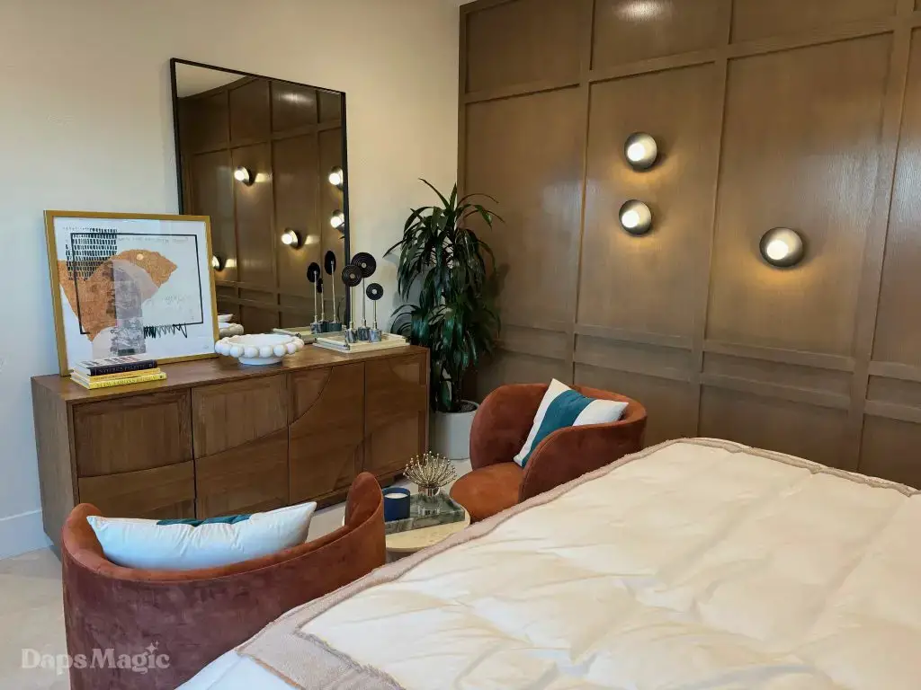 The next stop was the Westwind Model from Woodbridge Pacific Group. Just a quick walk down the street, the sun was setting as the group made its way for dinner at this house. As the sunlight glowed behind the mountains, the whole community felt magical. The area is surprisingly quiet. For as many businesses and houses that are in the general area outside of Cotino, you’d never know. It really is a peaceful place, which I think is a huge selling point in itself. The house itself was really impressive. This house was on a bigger lot and was larger than the first house we visited. It also was more spread out. While it was very different, it also felt like it came from the same community as the first one. There were a lot of features to be found throughout this house. There was a lovely office just inside the front door. On the other side of the entry way, there was a suite that is probably meant to be the primary one. It had a MASSIVE closet, an incredible bathroom (also very large), and a lovely bedroom. Both the bathroom and bedroom had views of the lovely backyard deck and pool. This also had a washer and dryer included in this suite.