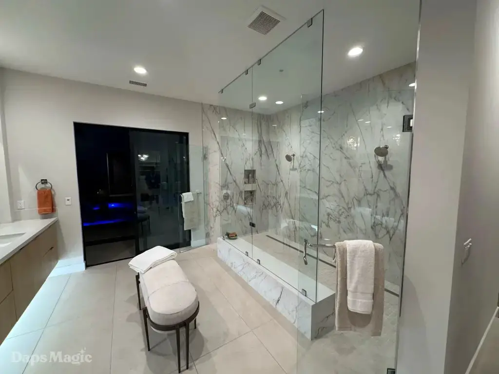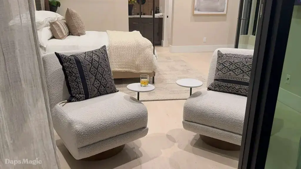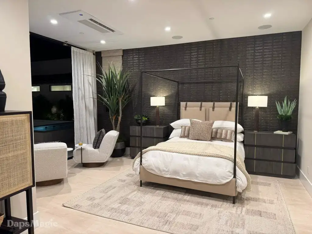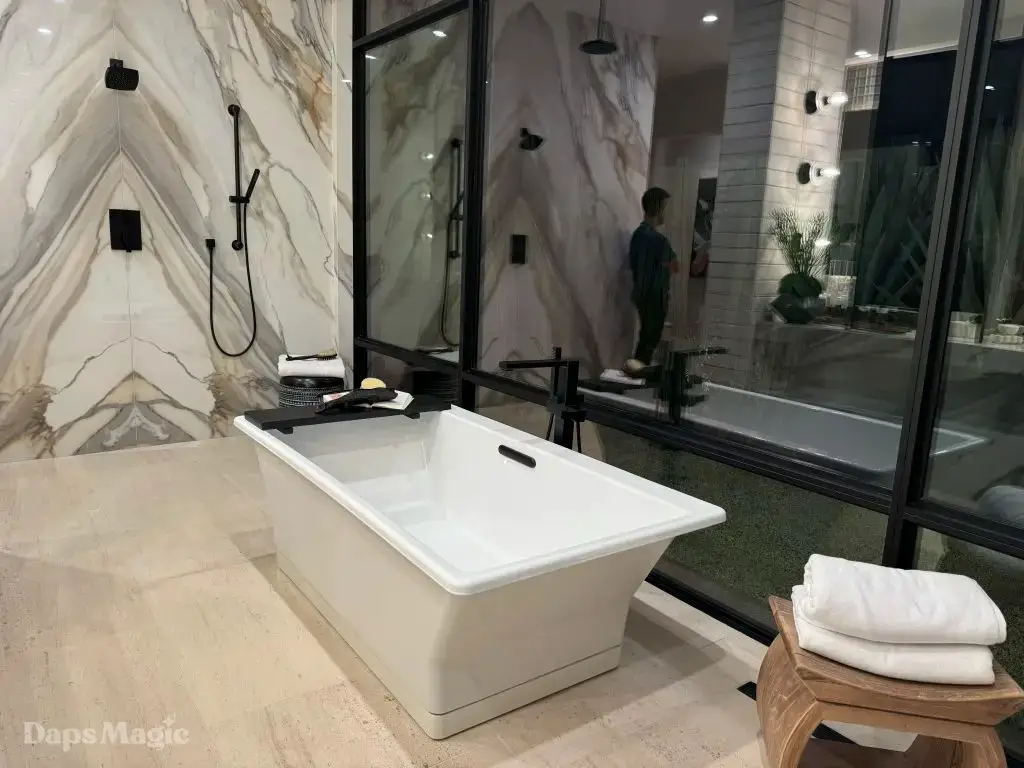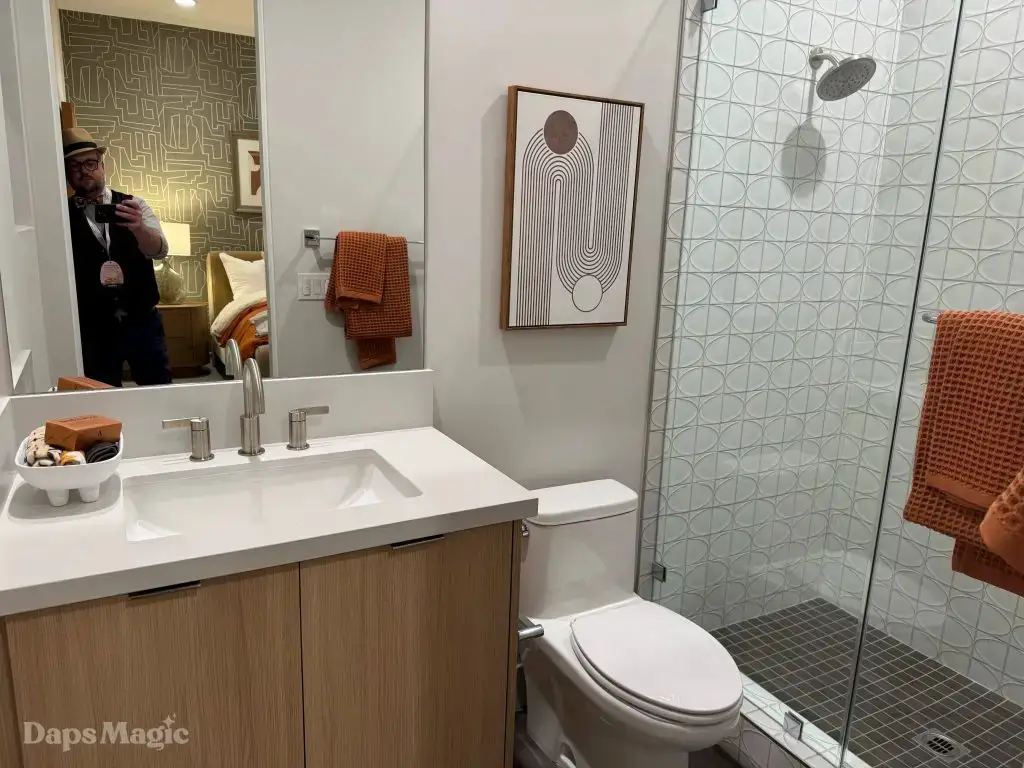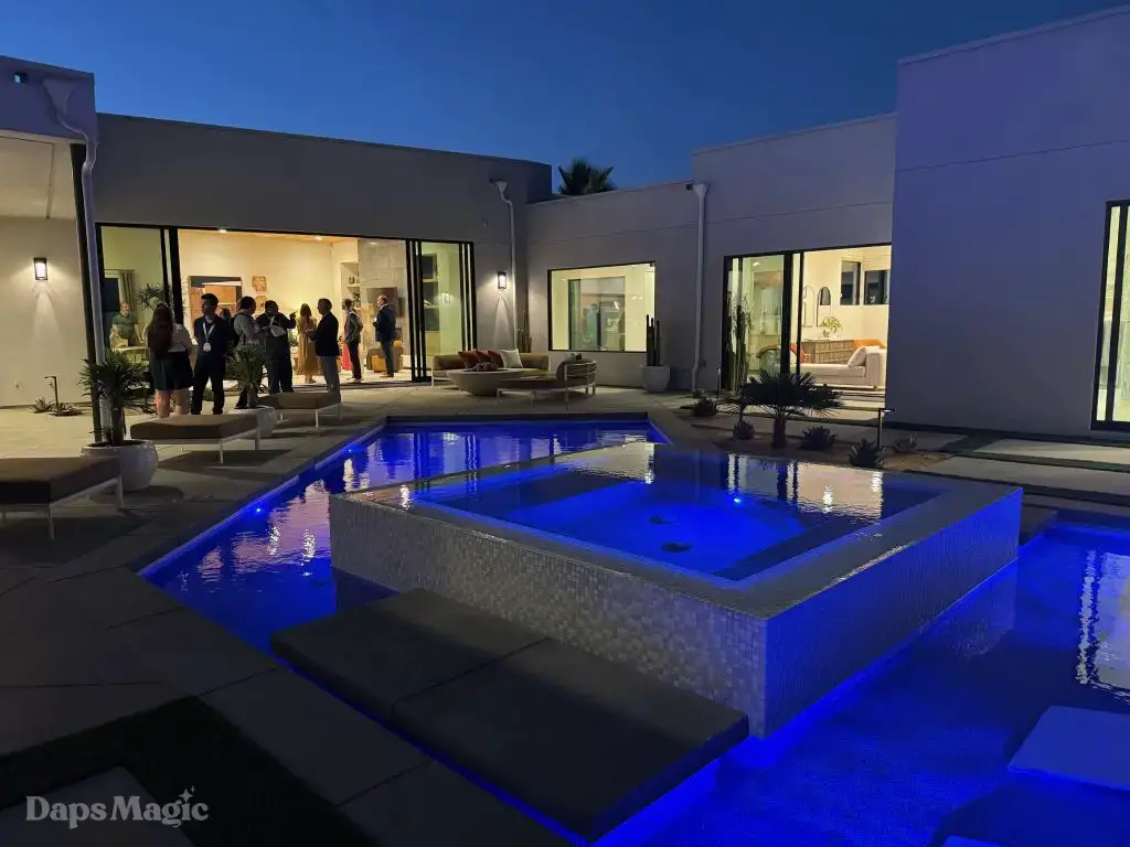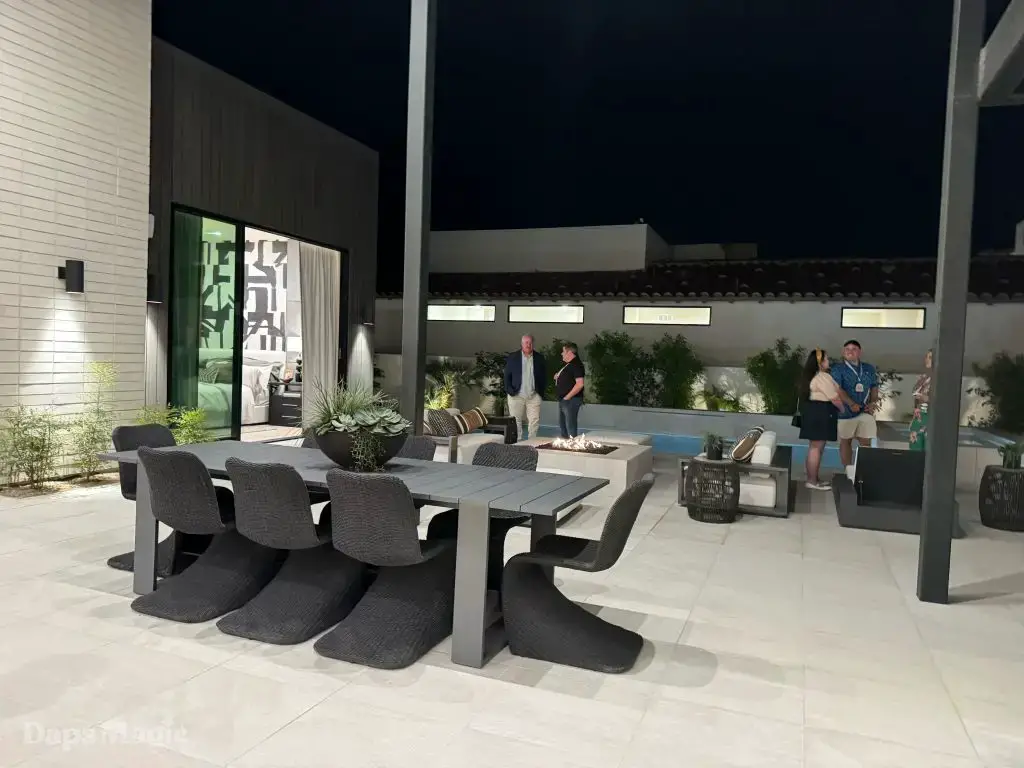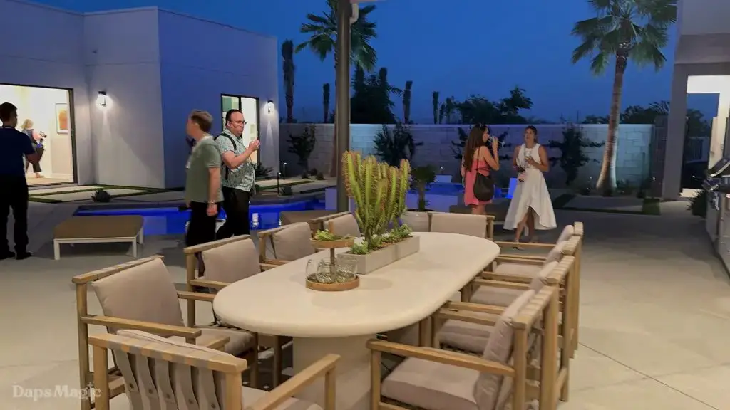 The back half of the house had two more bedrooms in this setup, along with a laundry room. One bedroom had a small outdoor space, bathroom, and decent sized closet. The other bedroom had what I’m going to call a bathroom suite. This included a bathtub with a shower at each end, the bathroom, sinks, and a substantial closet. This one got just about everyone at the event talking about it. It really was impressive. This bedroom was also one of the two that had doors that looked out at the patio/pool space.