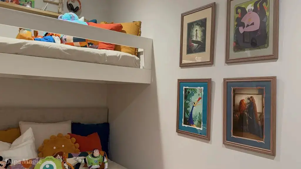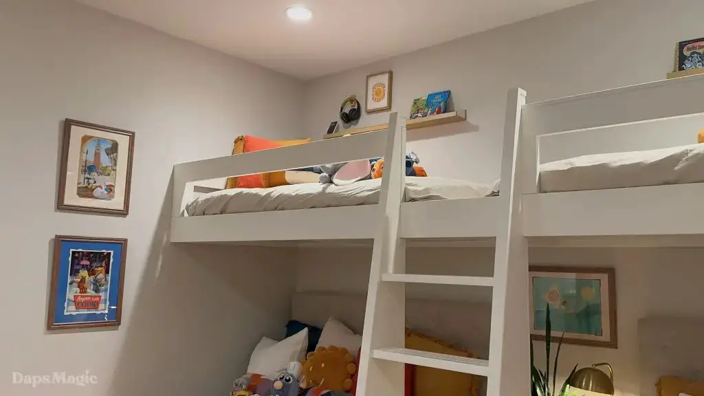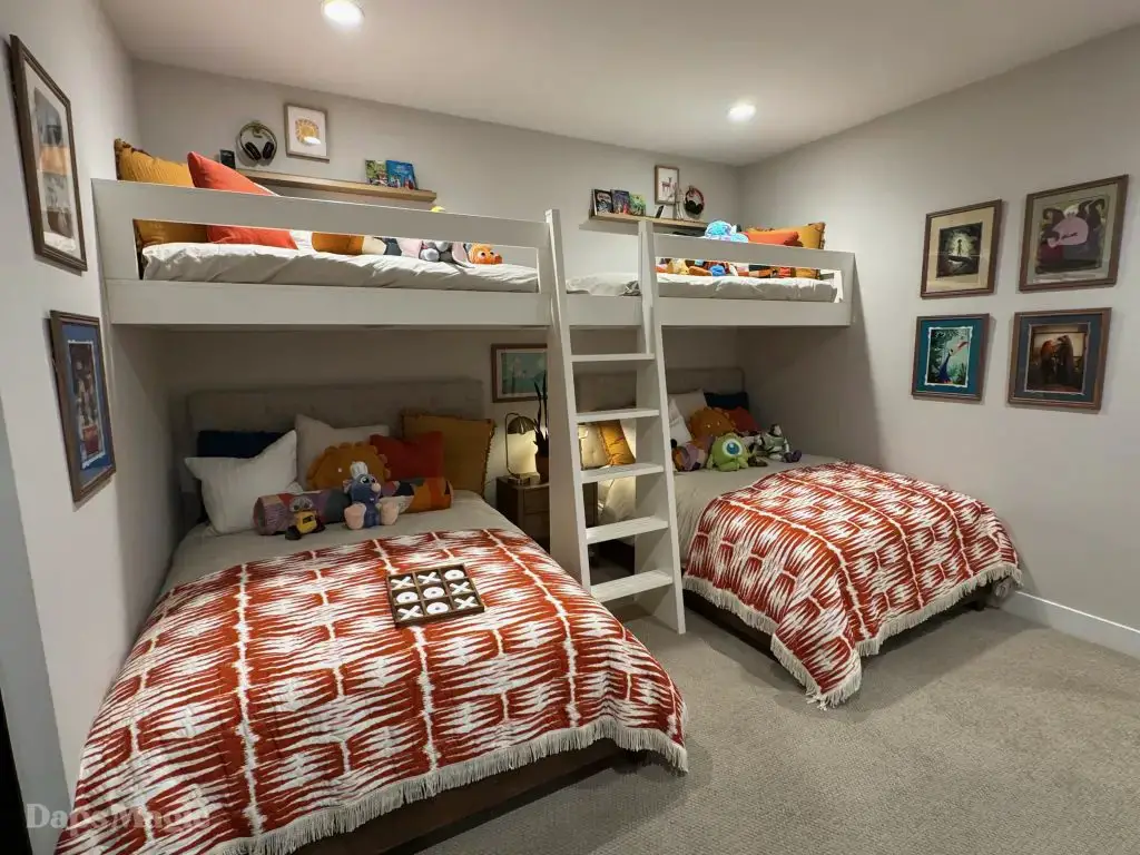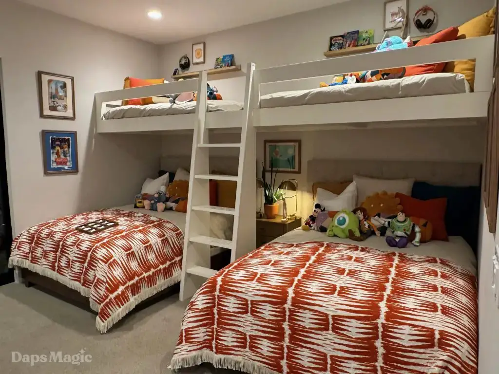 Further inside the house there was a large living room and kitchen that were next to each other. Behind this, there was another lounge/living room and a hallway that led to more bedrooms and bathrooms. Behind the the bedrooms, there were small backyard decks as well. This part of the house also had a laundry room. One of the bedrooms had been made up with some incredible bunk beds and Disney decorations that were absolutely charming. This wasn’t all there was to the house, however.