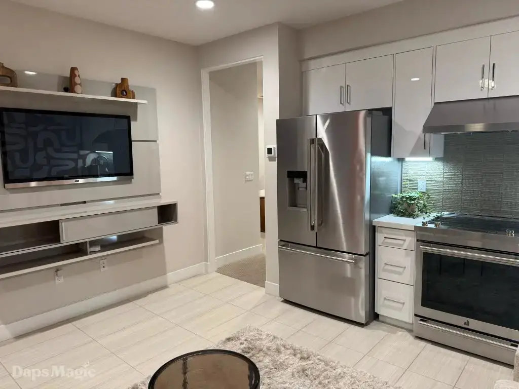 Over the three-car garage (that was hidden from the street), there was another suite. This had an entrance from outside the house (that could be accessed from the main backyard deck/pool area). Once at the top of the stairs, there was an incredible little living room with a kitchenette and television. Windows in this room looked out over the pool and deck area. Behind this room, there was a bedroom and bathroom. This is a space I would probably live in if I were to ever own a house like this.