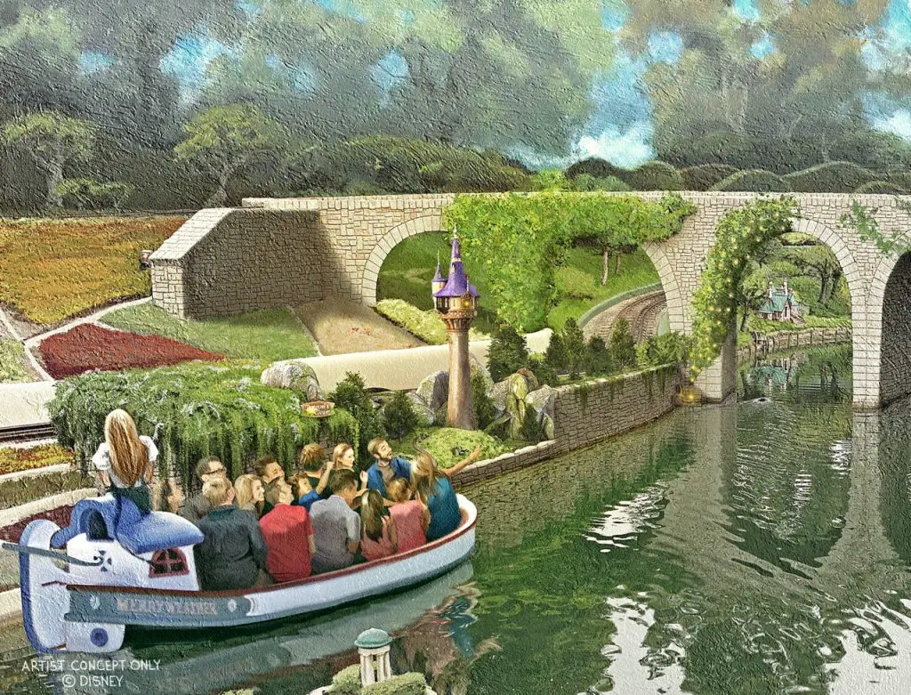 Disneyland’s Storybook Land Canal Boats is getting a new story, structure, and even music! When the attraction reopens this weekend, it will include a new miniature of Rapunzel’s tower from Walt Disney Animation Studios’ Tangled. The addition to the attraction will debut as a part of the Disneyland Resort 70th Celebration. It will be found among the beautiful miniature homes, villages, and castles that bring to life some of your favorite Disney fairy tales. Specifically, Rapunzel’s Tower will be found between the Patchwork Quilt and Toad Hall. Disney shared concept art of what this will look like when the attraction reopens this winter: