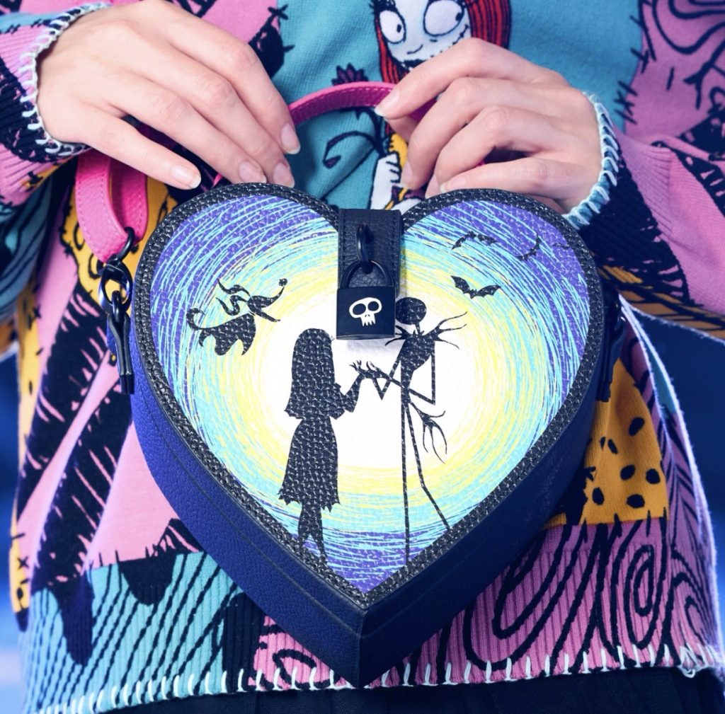 Another accessory is Tim Burton’s The Nightmare Before Christmas Heart Crossbody Bag. Halloween Town’s sweetheart couple share a tender moment on the front of this romantic crossbody. The heart-shaped bag with pebble finish features Jack Skellington and Sally holding hands while Zero and bats fly around. The magnetic snap tag features a decorative metal padlock with a skull, which is a key feature of this haunting handbag. This crossbody is priced at £22.50.