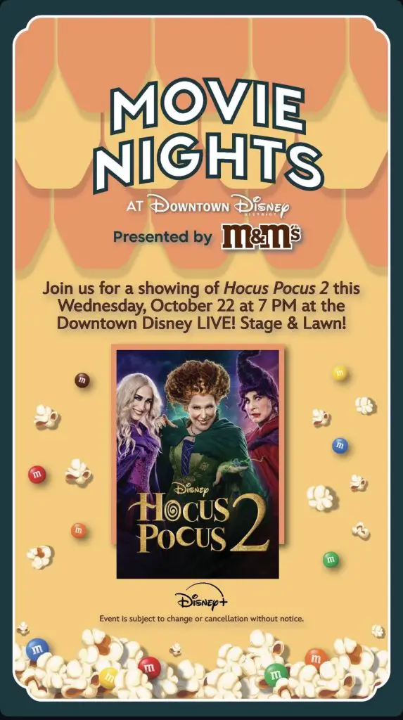 This week’s movie has been announced for fans wanting to have this movie-going experience. The film will be Hocus Pocus 2. This will be presented at the Downtown Disney LIVE! Stage and Lawn at October 22, 2025 at 7:00 PM. The following was posted on the Downtown Disney District Instagram handle: