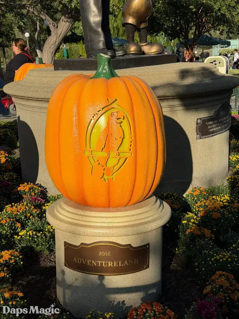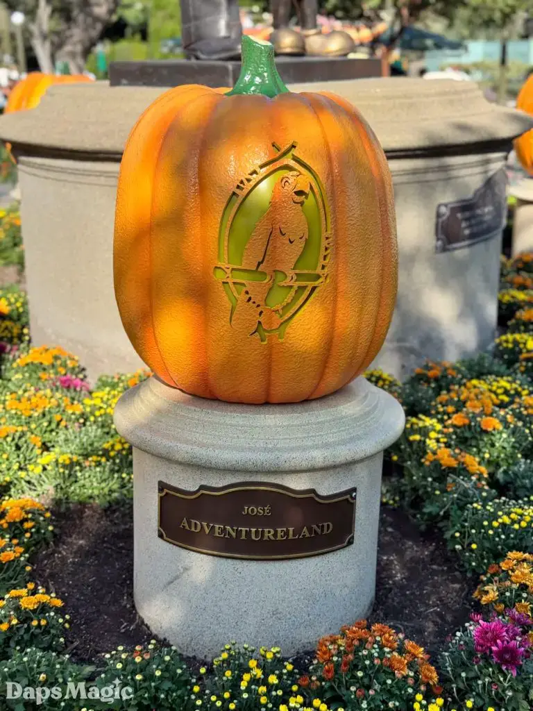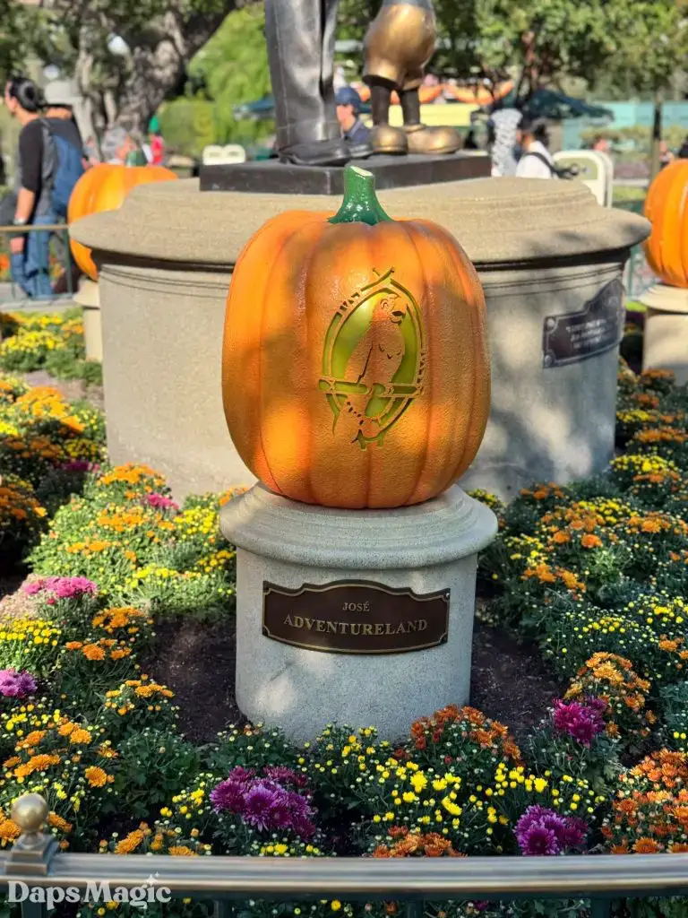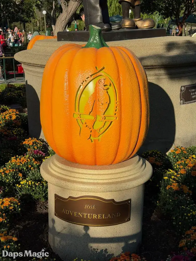 A tradition during Halloween Time each year is the installation of Jack-O-Lanterns around the Partners Statue at Disneyland. These pumpkins represent each of the lands in the park, except Star Wars: Galaxy’s Edge. Until recently, Adventureland was represented by a Jack-O-Lantern of Tarzan. This week, that pumpkin was replaced with a new one. Now, Adventureland is represented by the likeness of Jose from Walt Disney’s Enchanted Tiki Room.