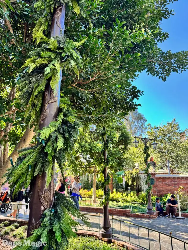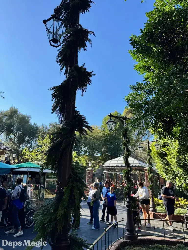Sleeping Beauty Castle isn’t the only thing getting ready for the holidays, however. Over in Magnolia Park, decorations are beginning to appear as well! While it is just wrapped, natural-looking garland currently, it is very possible that more will appear at a later date. Check out the photos here: