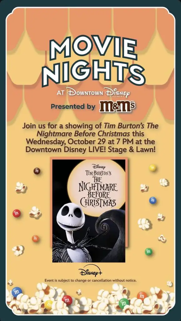 This week, the movie of the week will be Tim Burton’s The Nightmare Before Christmas. The film is a Halloween favorite with Disney fans, and also a Christmas favorite, and also a year-round favorite. Over at Disneyland, Jack Skellington takes over the Haunted Mansion each Halloween Time and Holiday season and transforms it into Haunted Mansion Holiday. Now, Jack Skellington will be taking over a part of Downtown Disney District for this Wednesday night of fun. The film will be presented at the Downtown Disney LIVE! Stage and Lawn on October 28, 2025, at 7:00 PM. The following was posted on the Downtown Disney District Instagram handle: