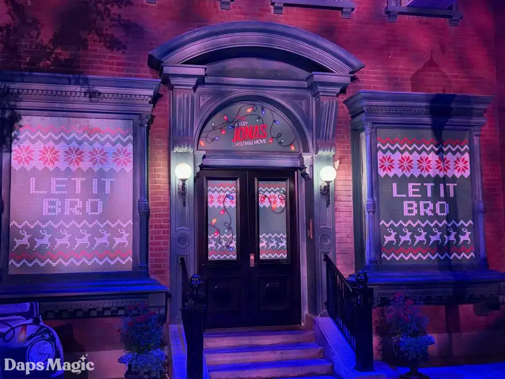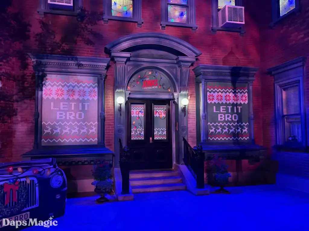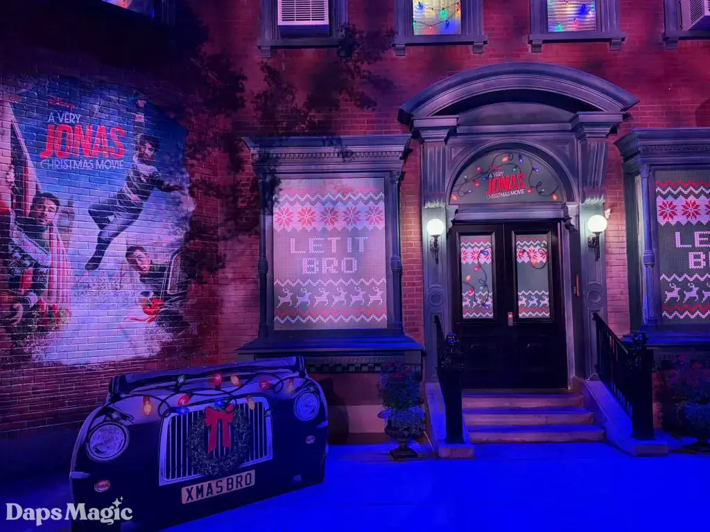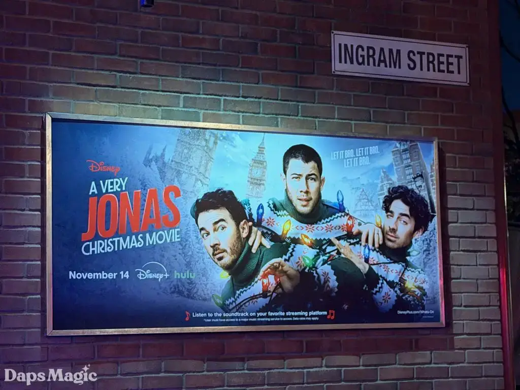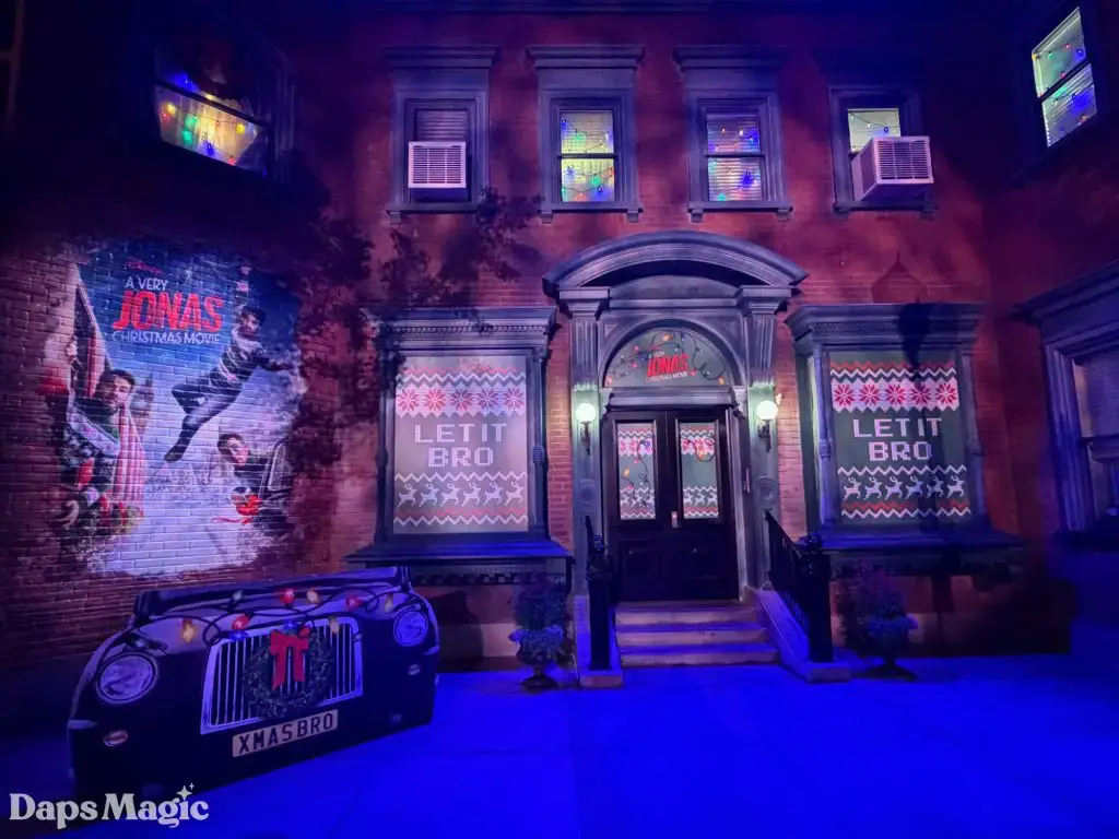A Very Jonas Christmas Movie will be arriving on Disney+ on November 14, 2025. When it does, fans will see the Jonas Brothers go on an adventure to get home for Christmas. This looks like a humorous, heartwarming Christmas movie with some fantastic music. Ahead of the arrival of this film, a photo op has appeared in Disney California Adventure. It has a place for people to pose like they are in a car and racing to get home in time for Christmas in front of the brick facade that could be one of the cities (or maybe even New York?) that appear in the movie.