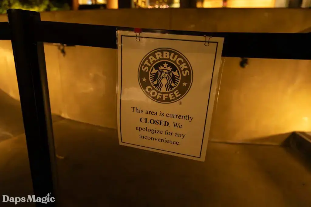 Over the weekend, the Starbucks in the Downtown Disney District at the Disneyland Resort unexpectedly closed. The location, which opened over a decade ago, remained closed on Monday morning after initially closing on Saturday. It remained closed all day Sunday with stanchions blocking the patio seating area and doors. The patio also had all of its furniture removed.