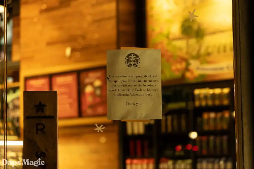 A sign on the door said the following: “Our location is temporarily closed. We apologize for the inconvenience. Please visit one of the locations inside Disneyland Park or Disney’s California Adventure Park. Thank you.”